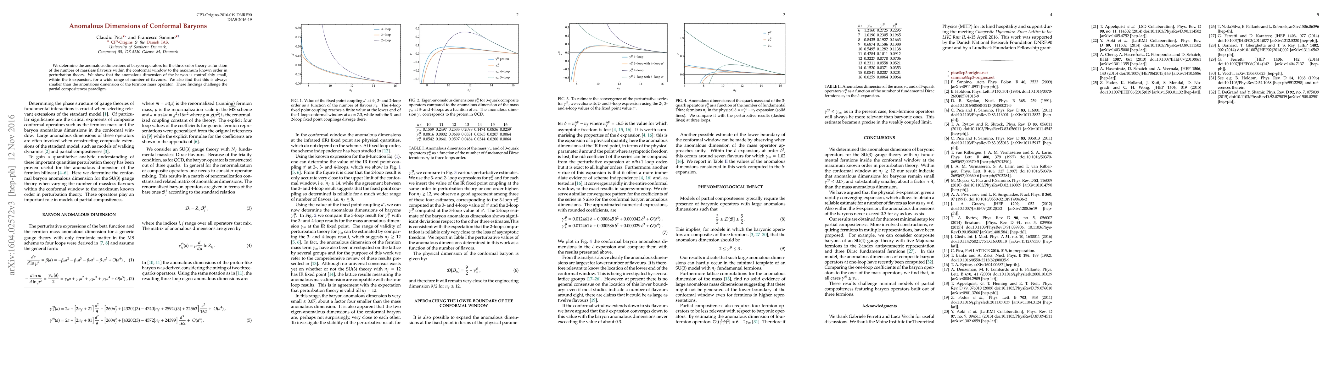 The paper calculates the anomalous dimensions of baryon operators in three-color theory, revealing they are controllably small for a broad range of flavors within the conformal window. This finding contradicts the partial compositeness paradigm.