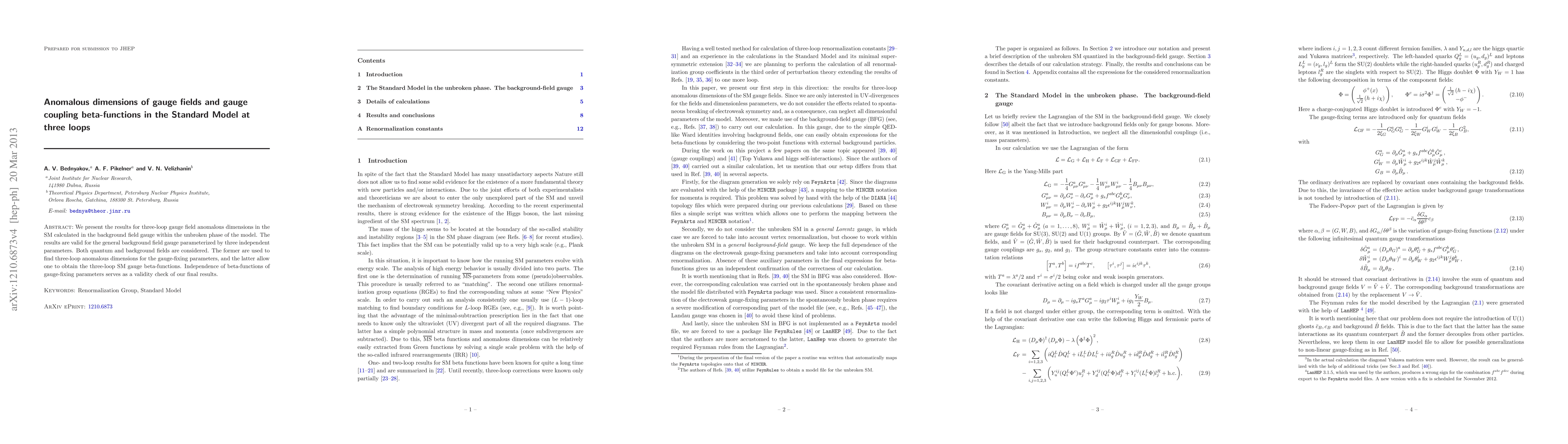 This research calculates three-loop anomalous dimensions of gauge fields and gauge coupling beta-functions in the Standard Model using the background field gauge method, validating the results through independence from gauge-fixing parameters. The study covers the general background field gauge parameterized by three independent parameters.