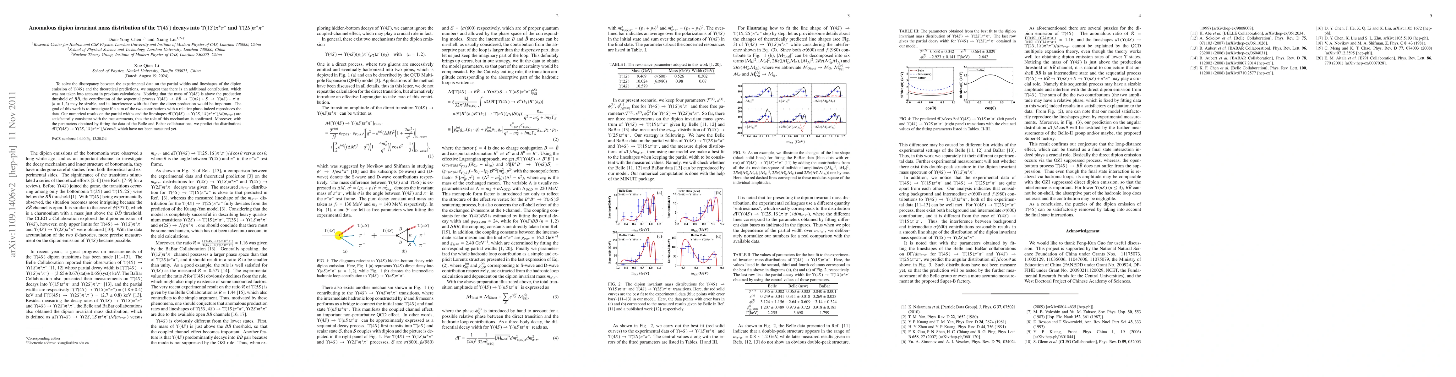 This paper investigates the anomalous dipion invariant mass distribution in $\Upsilon(4S)$ decays, proposing an additional sequential process contribution that reconciles experimental data with theoretical predictions. The study confirms the importance of this mechanism through numerical results consistent with measurements, and predicts unmeasured angular distributions.