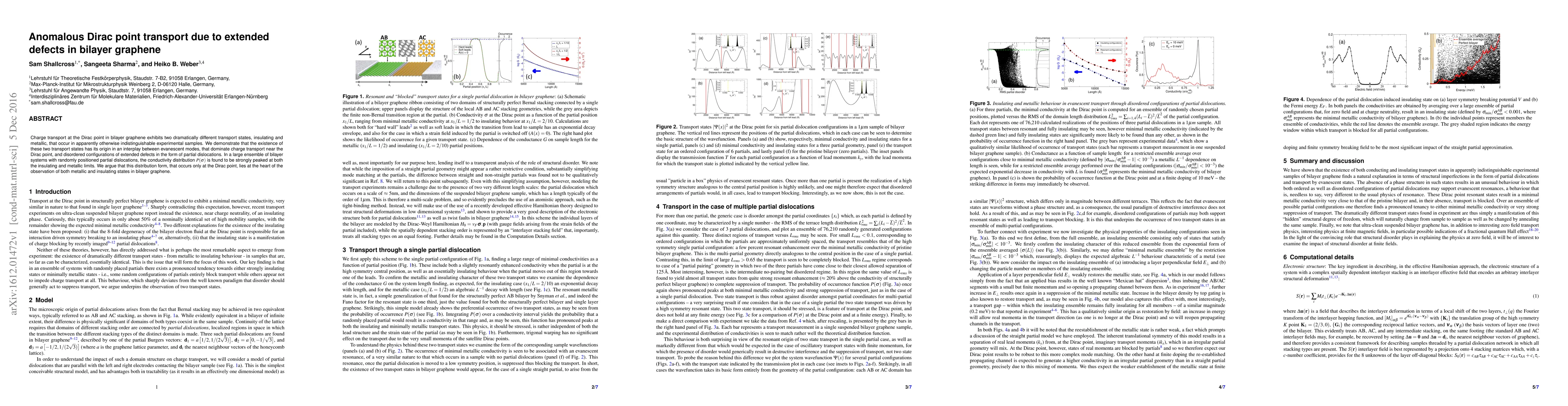The research reveals that charge transport at the Dirac point in bilayer graphene can exhibit insulating or metallic states due to the influence of partial dislocations, which interact with evanescent modes, leading to a strongly peaked conductivity distribution $P(\sigma)$ at both limits. This unique behavior at the Dirac point explains the presence of both transport states in bilayer graphene.