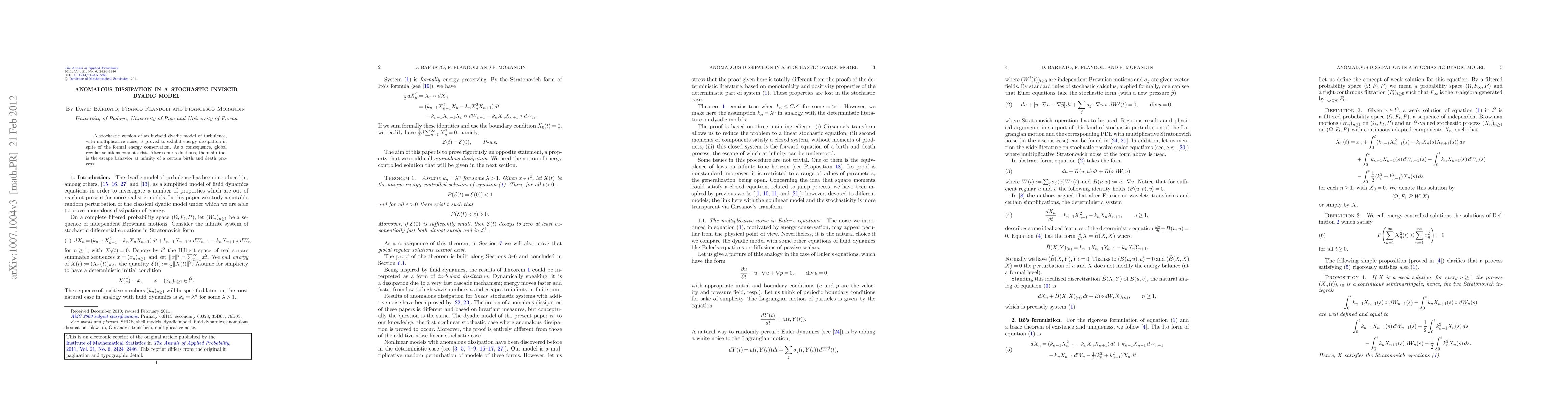 This paper demonstrates that a stochastic inviscid dyadic turbulence model, despite formal energy conservation, shows anomalous dissipation due to multiplicative noise. It concludes that global regular solutions are impossible, utilizing the escape behavior of a birth and death process at infinity.