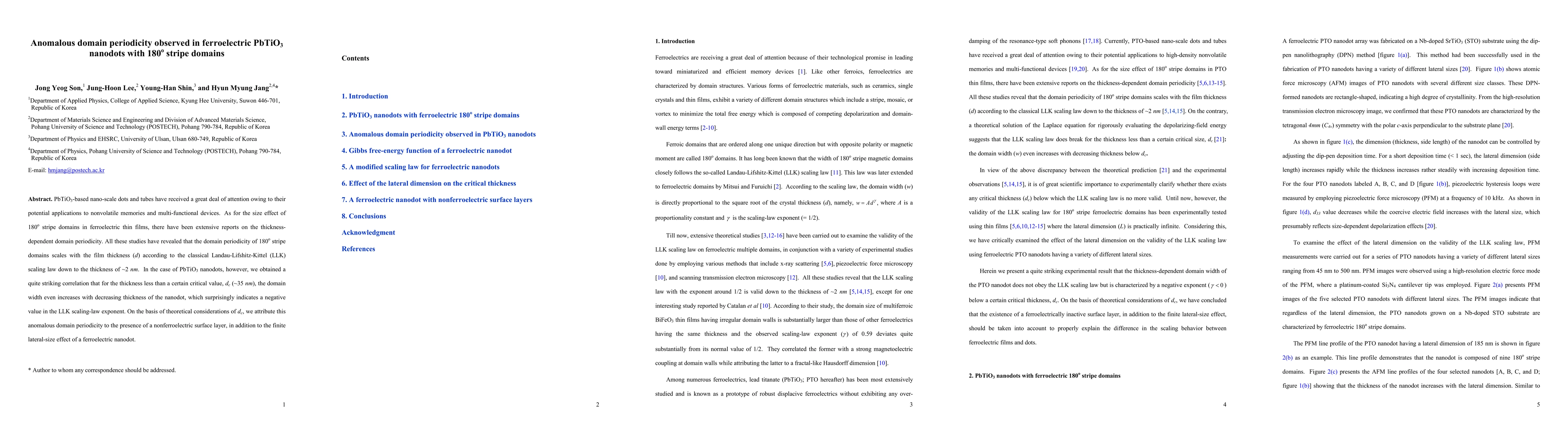 This study reveals an unexpected increase in domain width of PbTiO3 nanodots with decreasing thickness below a critical value, contrary to the classical LLK scaling law, suggesting a nonferroelectric surface layer and finite lateral-size effects influence domain periodicity.