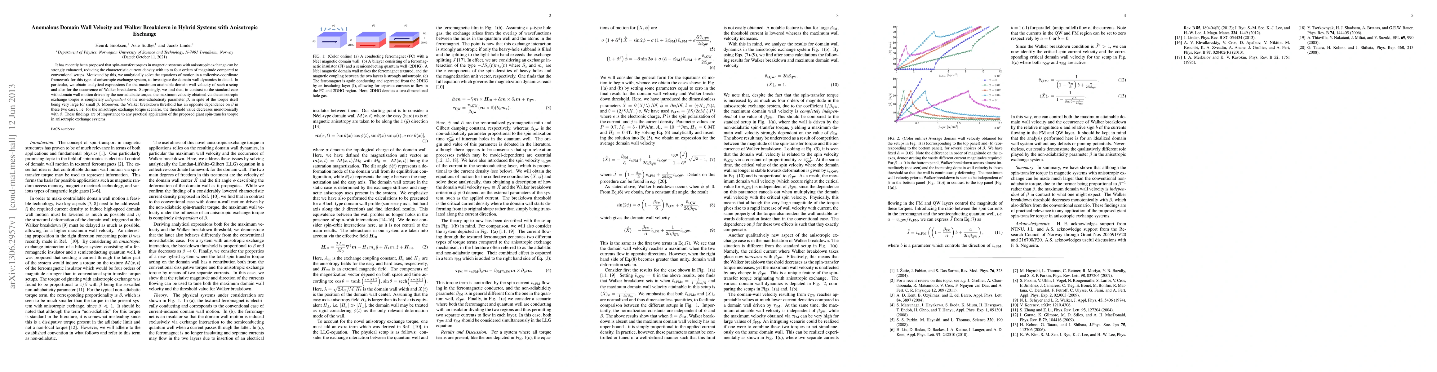 This paper investigates domain wall dynamics in magnetic systems with anisotropic exchange, finding that the maximum domain wall velocity is independent of the nonadiabaticity parameter despite large torques, and Walker breakdown threshold decreases with decreasing nonadiabaticity. These results have significant implications for the application of enhanced spin-transfer torques in such systems.