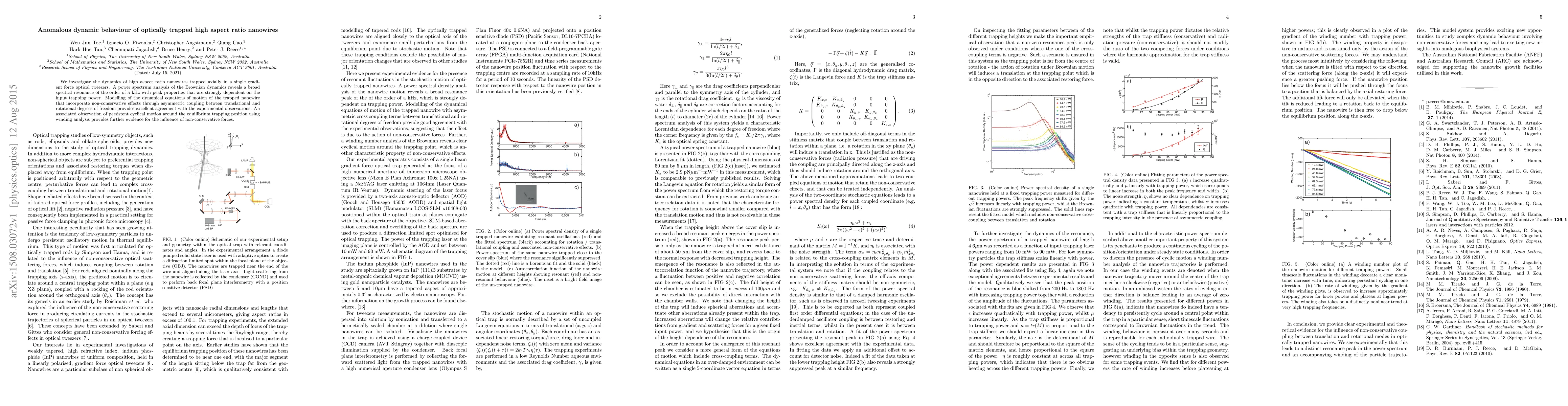 We investigate the dynamics of high aspect ratio nanowires trapped axially in a single gradient force optical tweezers. A power spectrum analysis of the Brownian dynamics reveals a broad spectral resonance of the order of a kHz with peak properties that are strongly dependent on the input trapping power. Modelling of the dynamical equations of motion of the trapped nanowire that incorporate non-conservative effects through asymmetric coupling between translational and rotational degrees of freedom provides excellent agreement with the experimental observations. An associated observation of persistent cyclical motion around the equilibrium trapping position using winding analysis provides further evidence for the influence of non-conservative forces.