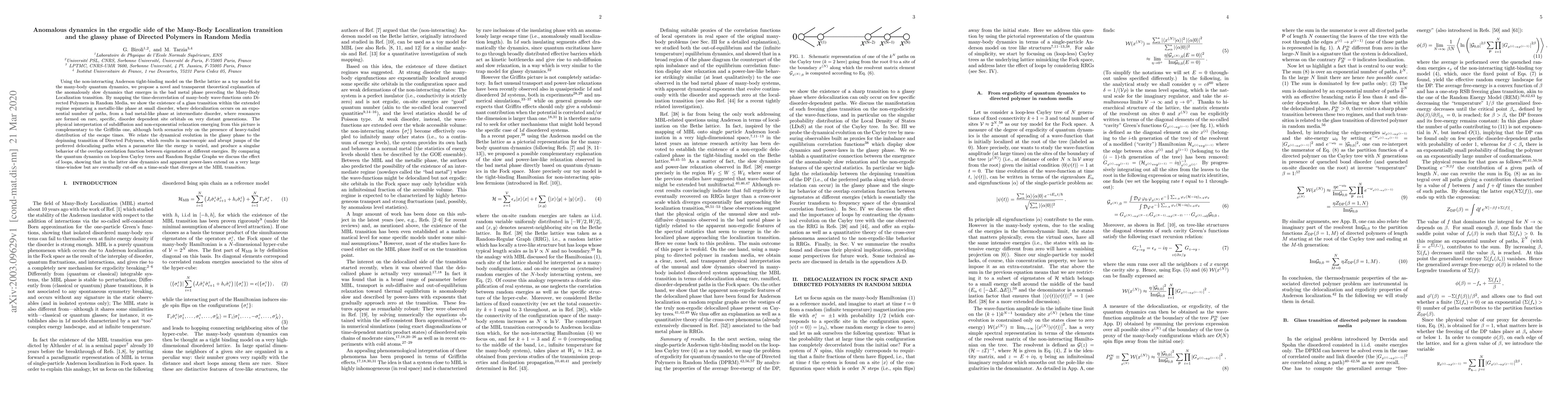 This paper proposes a theoretical framework to explain the anomalously slow dynamics in the ergodic phase of Many-Body Localization (MBL) transition, using the Anderson tight-binding model. It maps the time-decorrelation of wave-functions to Directed Polymers in Random Media, revealing a glassy phase characterized by subdiffusion and non-exponential relaxation, akin to the Griffiths effect, and relates it to the depinning transition of Directed Polymers.
