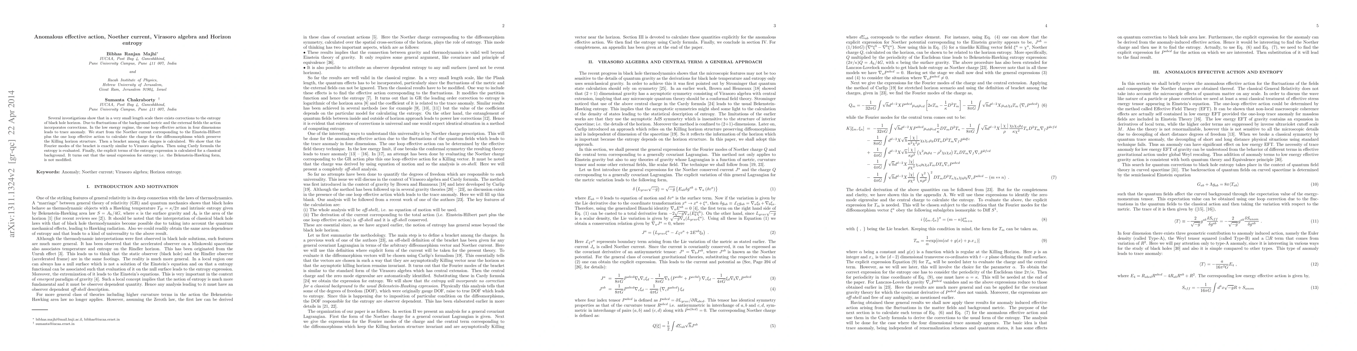 Several investigations show that in a very small length scale there exists corrections to the entropy of black hole horizon. Due to fluctuations of the background metric and the external fields the action incorporates corrections. In the low energy regime, the one loop effective action in four dimensions leads to trace anomaly. We start from the Noether current corresponding to the Einstein-Hilbert plus the one loop effective action to calculate the charge for the diffeomorphisms which preserve the Killing horizon structure. Then a bracket among the charges is calculated. We show that the Fourier modes of the bracket is exactly similar to Virasoro algebra. Then using Cardy formula the entropy is evaluated. Finally, the explicit terms of the entropy expression is calculated for a classical background. It turns out that the usual expression for entropy; i.e. the Bekenstein-Hawking form, is not modified.