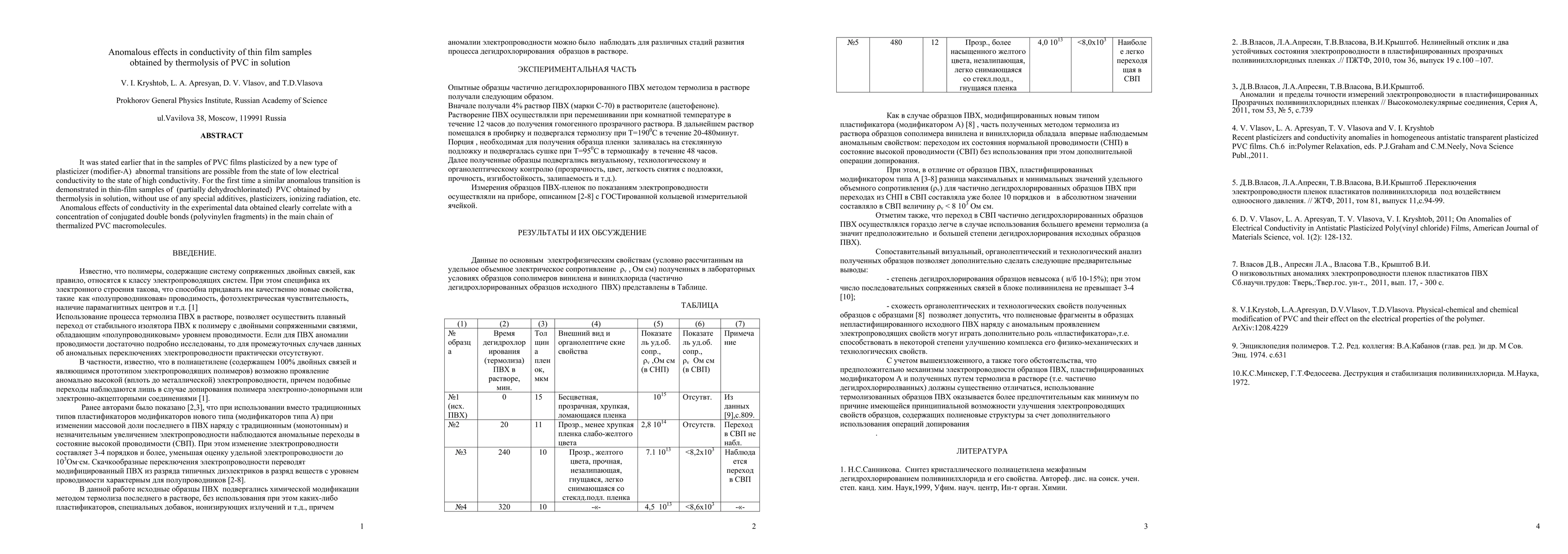 It was stated earlier that in the samples of PVC films plasticized by a new type of plasticizer (modifier-A) abnormal transitions are possible from the state of low electrical conductivity to the state of high conductivity. For the first time a similar anomalous transition is demonstrated in thin-film samples of (partially dehydrochlorinated) PVC obtained by thermolysis in solution, without use of any special additives, plasticizers, ionizing radiation, etc. Anomalous effects of conductivity in the experimental data obtained clearly correlate with a concentration of conjugated double bonds (polyvinylen fragments) in the main chain of thermalized PVC macromolecules.