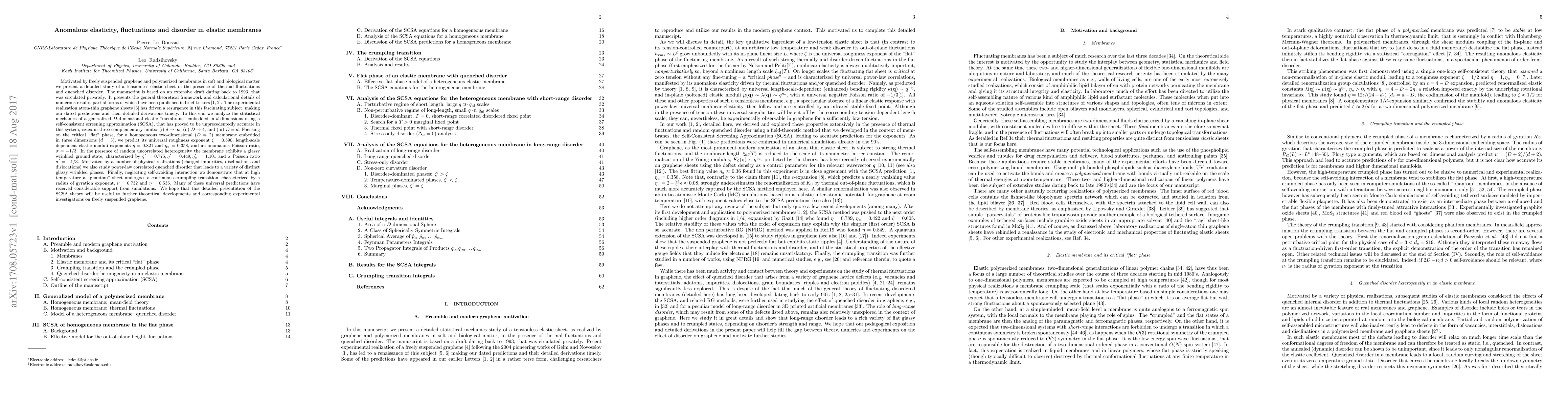 The paper presents a theoretical framework using self-consistent screening approximation (SCSA) to study a tensionless elastic sheet in 2D embedded in 3D, with thermal fluctuations and disorder. Key findings include predictions of the membrane's roughness, elastic moduli exponents, and a negative Poisson ratio of -1/3. The study also extends to random heterogeneity and a continuous crumpling transition, aiming to guide future theoretical and experimental work on materials like graphene.