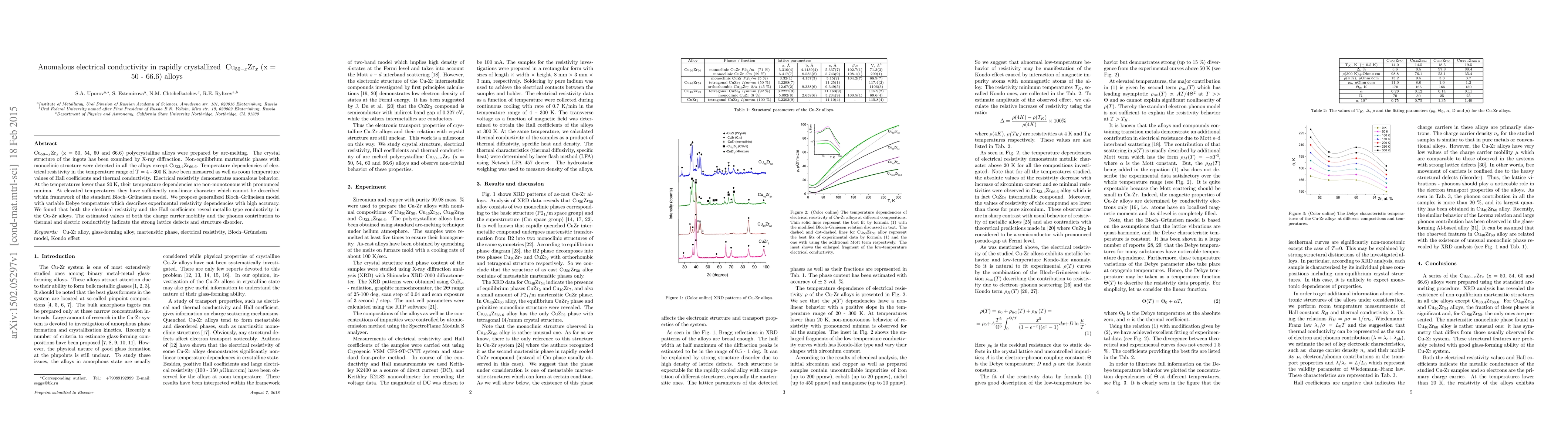 This study investigates the electrical conductivity of rapidly crystallized Cu${}_{50-x}$Zr${}_{x}$ alloys, revealing anomalous resistivity behavior with non-monotonic temperature dependencies below 20 K and non-linear characteristics at higher temperatures. The proposed generalized Bloch-Grüneisen model with variable Debye temperature accurately describes these observations, indicating strong lattice defects and structural disorder.