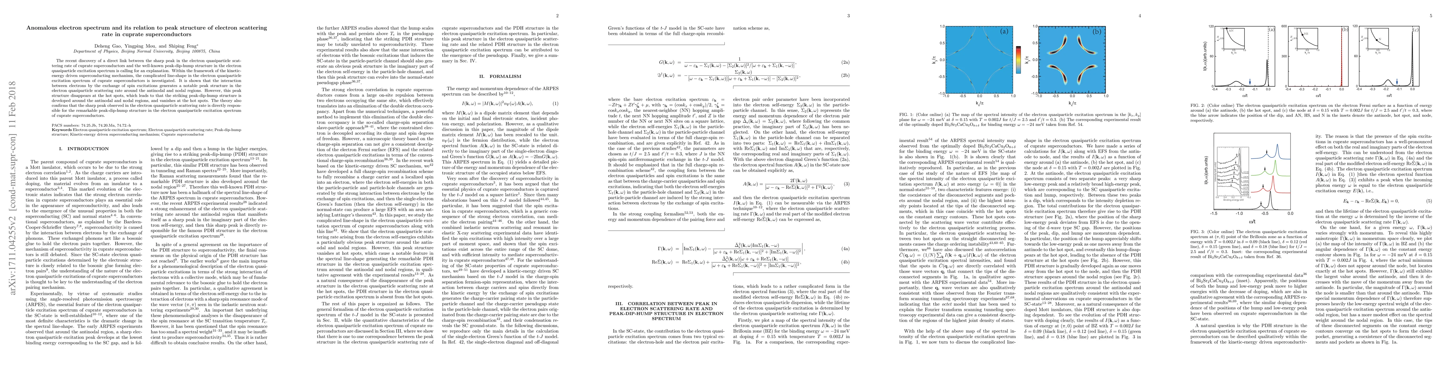 This paper investigates the anomalous electron spectrum in cuprate superconductors, linking the sharp peak in the electron quasiparticle scattering rate to the peak-dip-hump structure in the excitation spectrum. The study reveals that spin excitations generate a notable peak in the scattering rate, which disappears at hot spots, explaining the observed spectral structure.