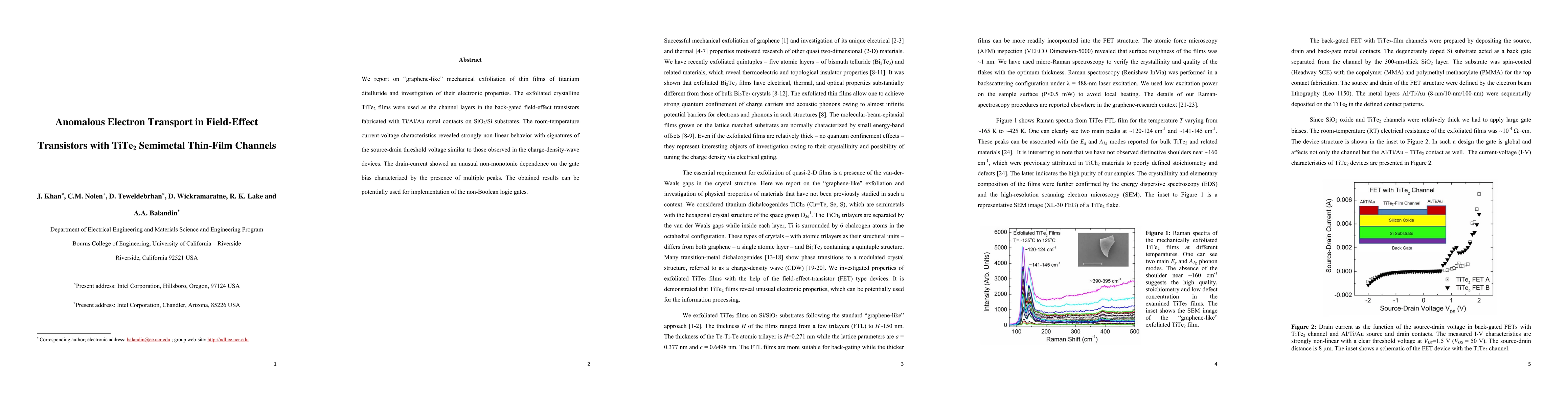 We report on "graphene-like" mechanical exfoliation of thin films of titanium ditelluride and investigation of their electronic properties. The exfoliated crystalline TiTe2 films were used as the channel layers in the back-gated field-effect transistors fabricated with Ti/Al/Au metal contacts on SiO2/Si substrates. The room-temperature current-voltage characteristics revealed strongly non-linear behavior with signatures of the source-drain threshold voltage similar to those observed in the charge-density-wave devices. The drain-current showed an unusual non-monotonic dependence on the gate bias characterized by the presence of multiple peaks. The obtained results can be potentially used for implementation of the non-Boolean logic gates.