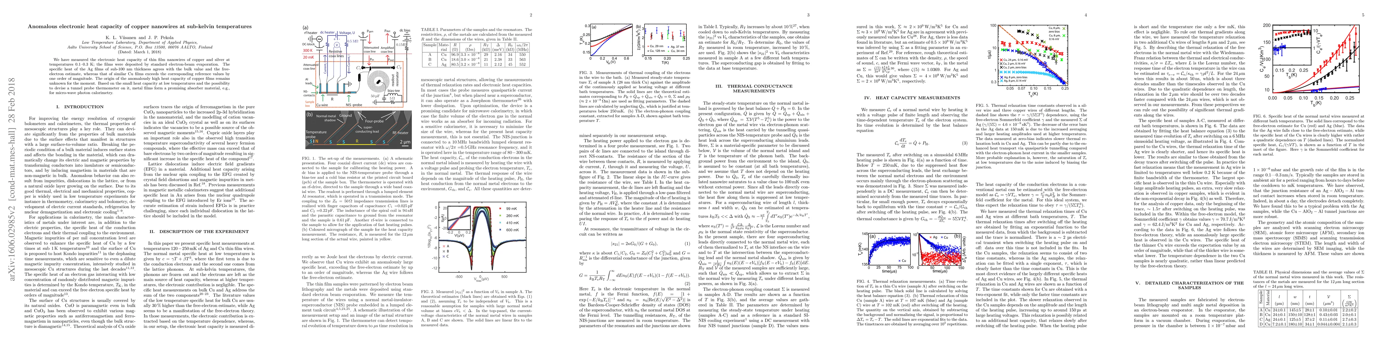 This study measures the electronic heat capacity of copper and silver nanowires at sub-kelvin temperatures, revealing that copper nanowires exhibit anomalously high heat capacity compared to bulk values, while silver nanowires match expected behavior, suggesting potential for microwave photon calorimetry applications. The cause of the copper anomaly remains undetermined.
