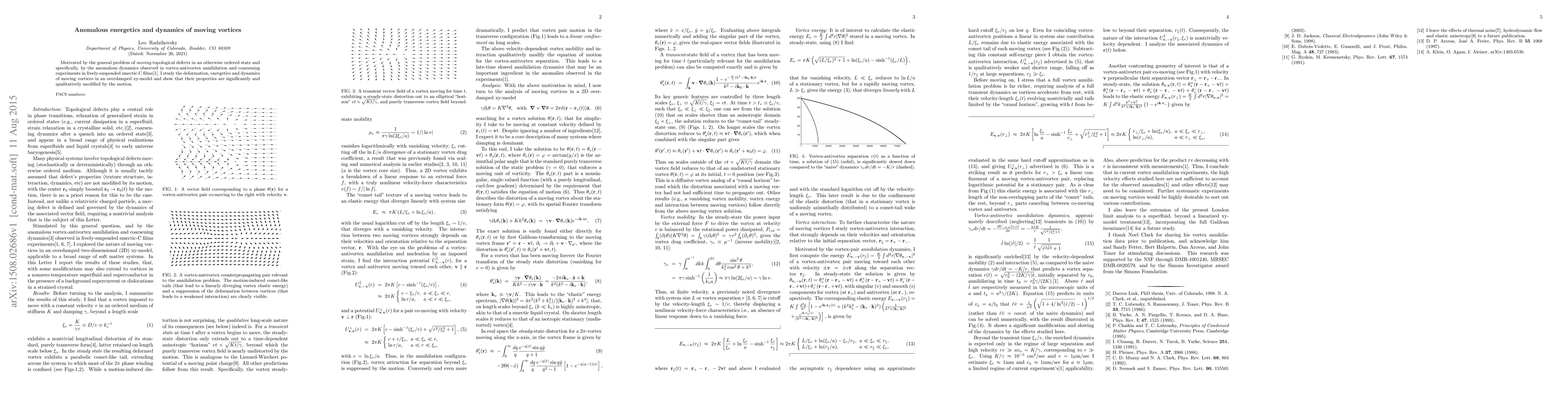 This paper investigates the anomalous dynamics and energetics of moving vortices in an overdamped xy-model, revealing significant qualitative modifications to their properties due to motion, inspired by observations in vortex-antivortex annihilation in smectic-C films.