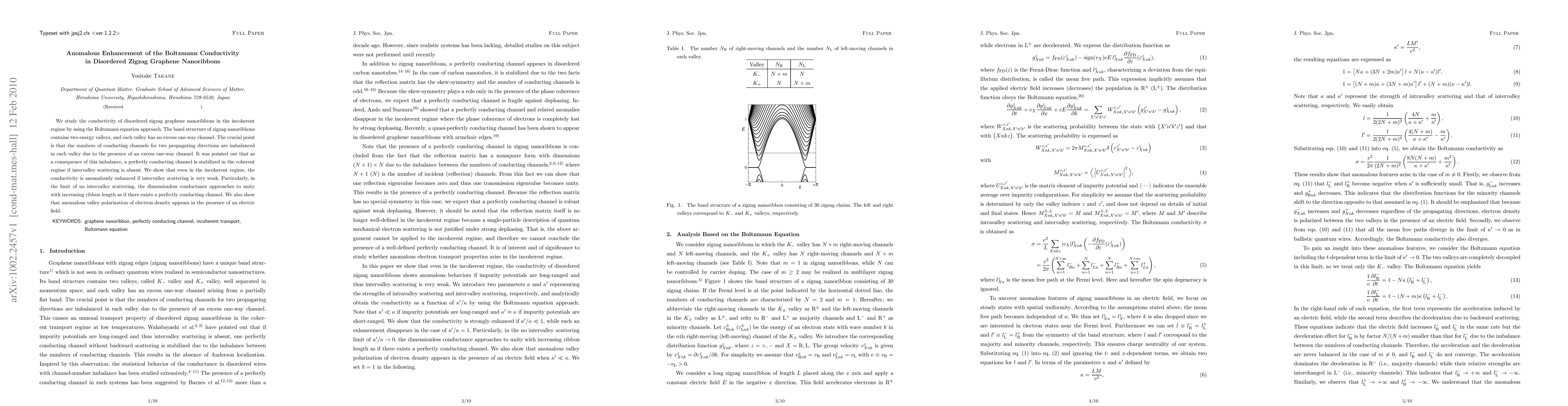 We study the conductivity of disordered zigzag graphene nanoribbons in the incoherent regime by using the Boltzmann equation approach. The band structure of zigzag nanoribbons contains two energy valleys, and each valley has an excess one-way channel. The crucial point is that the numbers of conducting channels for two propagating directions are imbalanced in each valley due to the presence of an excess one-way channel. It was pointed out that as a consequence of this imbalance, a perfectly conducting channel is stabilized in the coherent regime if intervalley scattering is absent. We show that even in the incoherent regime, the conductivity is anomalously enhanced if intervalley scattering is very weak. Particularly, in the limit of no intervalley scattering, the dimensionless conductance approaches to unity with increasing ribbon length as if there exists a perfectly conducting channel. We also show that anomalous valley polarization of electron density appears in the presence of an electric field.