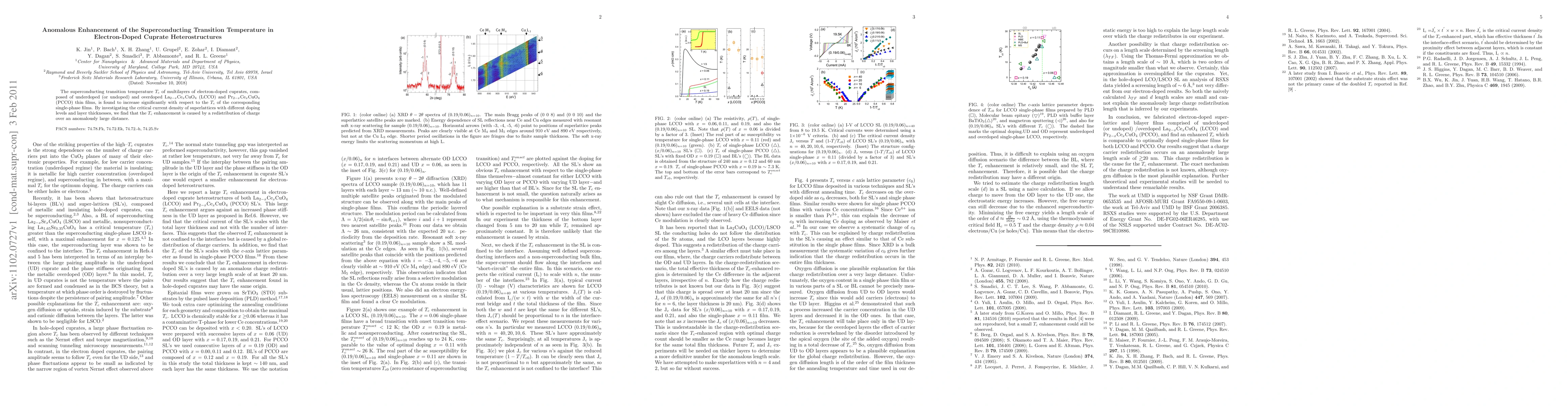 The superconducting transition temperature $T_{c}$ of multilayers of electron-doped cuprates, composed of underdoped (or undoped) and overdoped La% $_{2-x}$Ce$_{x}$CuO$_{4}$ (LCCO) and Pr$_{2-x}$Ce$_{x}$CuO$_{4}$ (PCCO) thin films, is found to increase significantly with respect to the $T_{c}$ of the corresponding single-phase films. By investigating the critical current density of superlattices with different doping levels and layer thicknesses, we find that the $T_{c}$ enhancement is caused by a redistribution of charge over an anomalously large distance.
