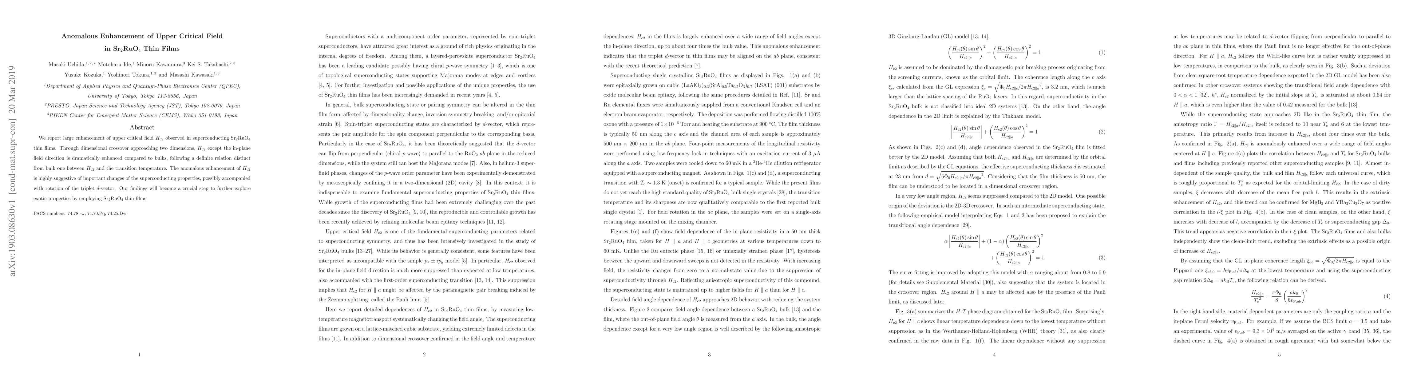 This paper reports a significant enhancement of the upper critical field Hc2 in superconducting Sr2RuO4 thin films, particularly in dimensions approaching two dimensions, suggesting notable changes in superconducting properties and potential triplet d-vector rotation. These findings are pivotal for exploring exotic properties in Sr2RuO4 thin films.