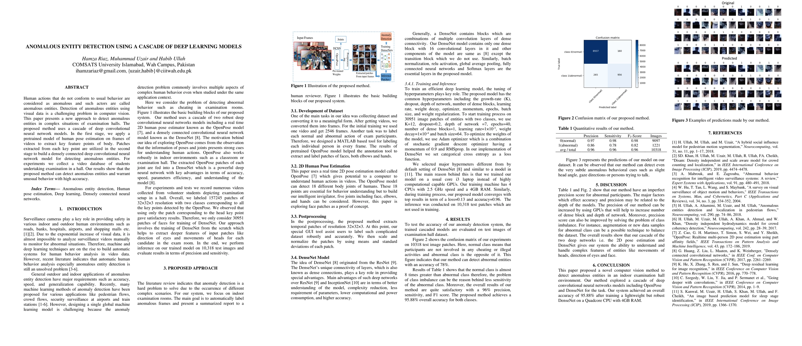 This paper proposes a cascade of deep learning models to detect anomalous entities in examination halls using visual data. It employs a pretrained human pose estimation model followed by a densely connected deep convolutional neural network to identify unusual behavior, achieving high accuracy in experiments with a collected video database.