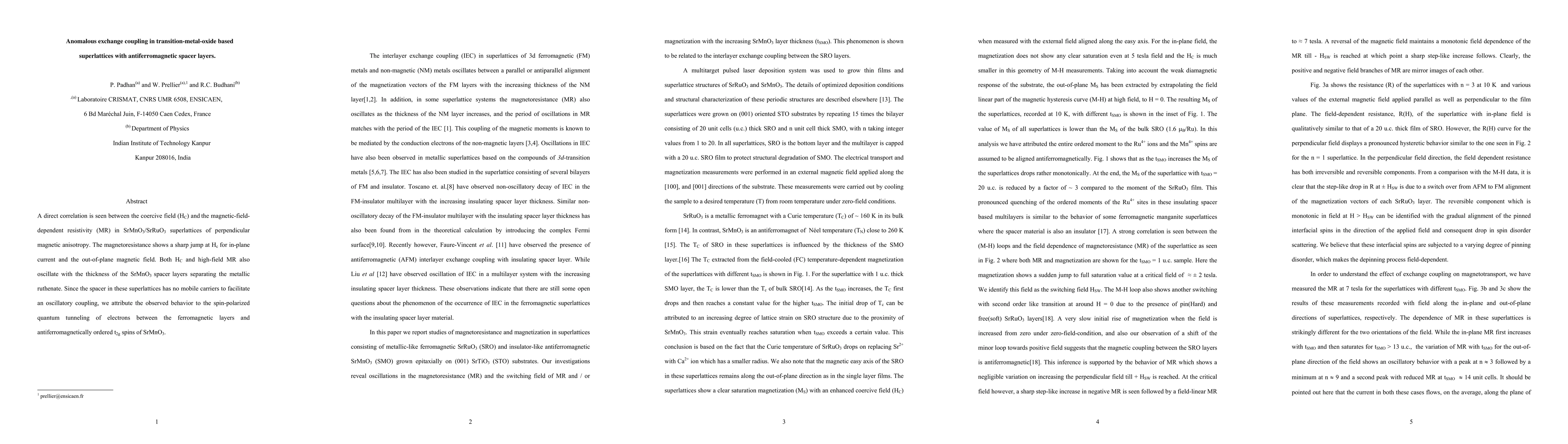The research finds a direct relationship between coercive field and magnetic-field-dependent resistivity in SrMnO3/SrRuO3 superlattices. This behavior is attributed to spin-polarized quantum tunneling of electrons between ferromagnetic layers and antiferromagnetic spins of SrMnO3 spacer layers, which have no mobile carriers for oscillatory coupling.