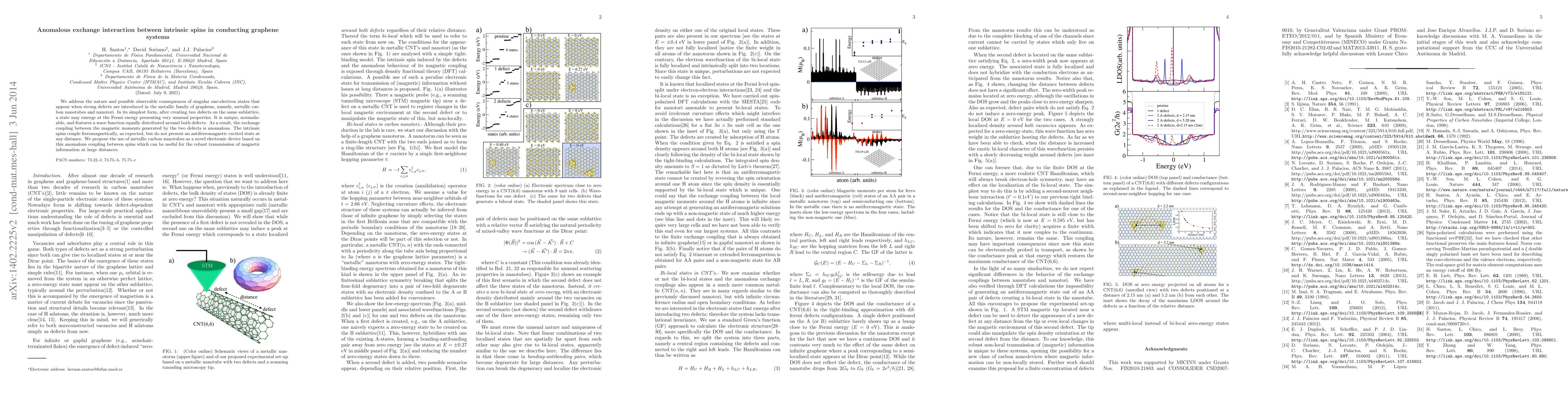 We address the nature and possible observable consequences of singular one-electron states that appear when strong defects are introduced in the metallic family of graphene, namely, metallic carbon nanotubes and nanotori. In its simplest form, after creating two defects on the same sublattice, a state may emerge at the Fermi energy presenting very unusual properties: It is unique, normalizable, and features a wave function equally distributed around both defects. As a result, the exchange coupling between the magnetic moments generated by the two defects is anomalous. The intrinsic spins couple ferromagnetically, as expected, but do not present an antiferromagnetic excited state at any distance. We propose the use of metallic carbon nanotubes as a novel electronic device based on this anomalous coupling between spins which can be useful for the robust transmission of magnetic information at large distances.