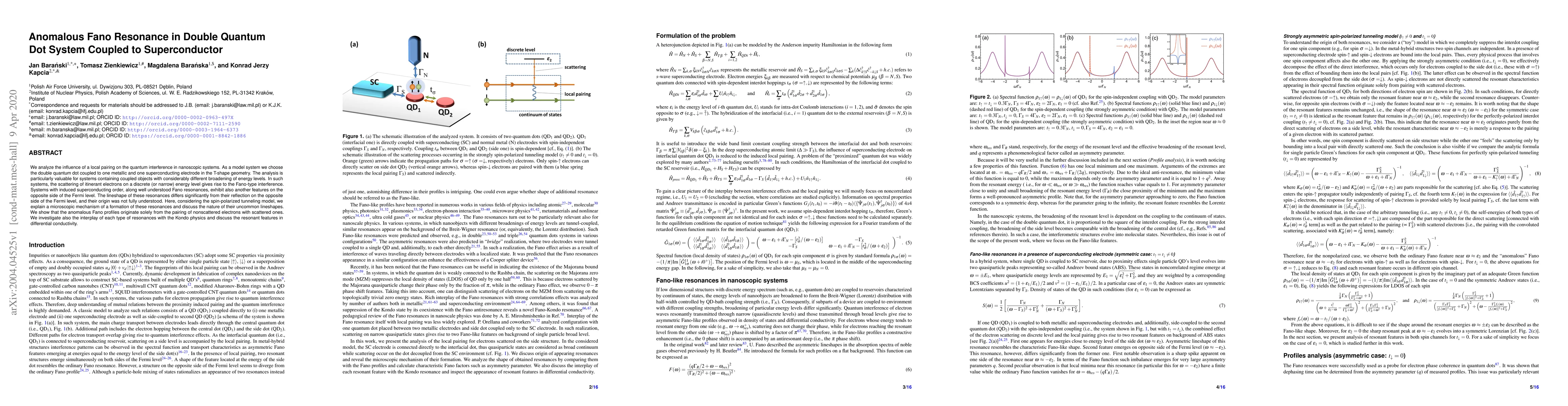 We analyze the influence of a local pairing on the quantum interference in nanoscopic systems. As a model system we choose the double quantum dot coupled to one metallic and one superconducting electrode in the T-shape geometry. The analysis is particularly valuable for systems containing coupled objects with considerably different broadening of energy levels. In such systems, the scattering of itinerant electrons on a discrete (or narrow) energy level gives rise to the Fano-type interference. Systems with induced superconducting order, along well understood Fano resonances, exhibit also another features on the opposite side of the Fermi level. The lineshape of these resonances differs significantly from their reflection on the opposite side of the Fermi level, and their origin was not fully understood. Here, considering the spin-polarized tunneling model, we explain a microscopic mechanism of a formation of these resonances and discuss the nature of their uncommon lineshapes. We show that the anomalous Fano profiles originate solely from the pairing of nonscattered electrons with scattered ones. We investigate also the interplay of each type of resonances with the Kondo physics and discuss the resonant features in differential conductivity.