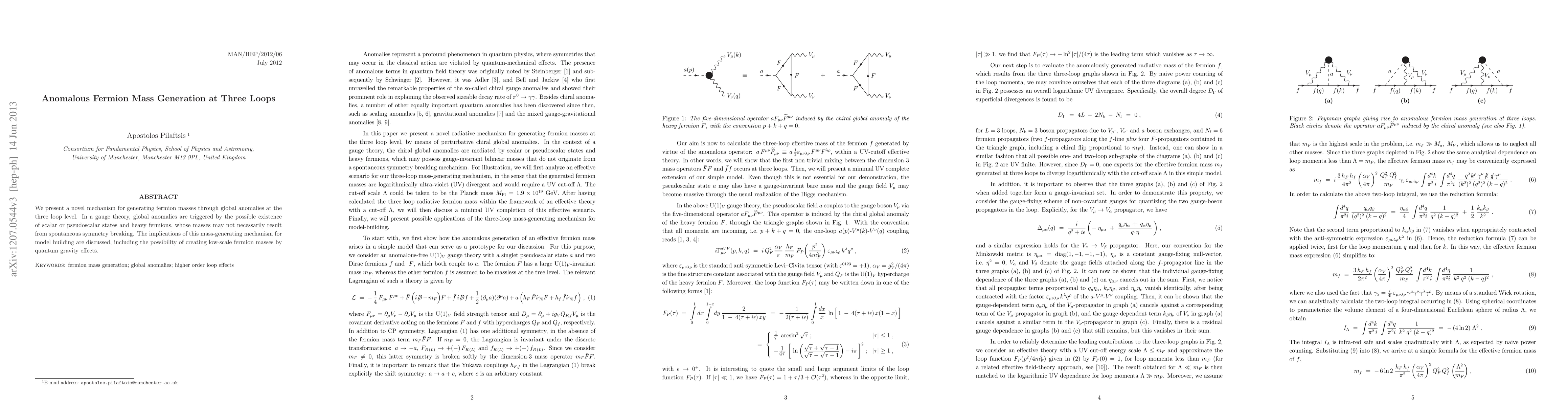 We present a novel mechanism for generating gauge-invariant fermion masses through global anomalies at the three loop level. In a gauge theory, global anomalies are triggered by the possible existence of scalar or pseudoscalar states and heavy fermions, whose masses may not necessarily result from spontaneous symmetry breaking. The implications of this mass-generating mechanism for model building are discussed, including the possibility of creating low-scale fermion masses by quantum gravity effects.