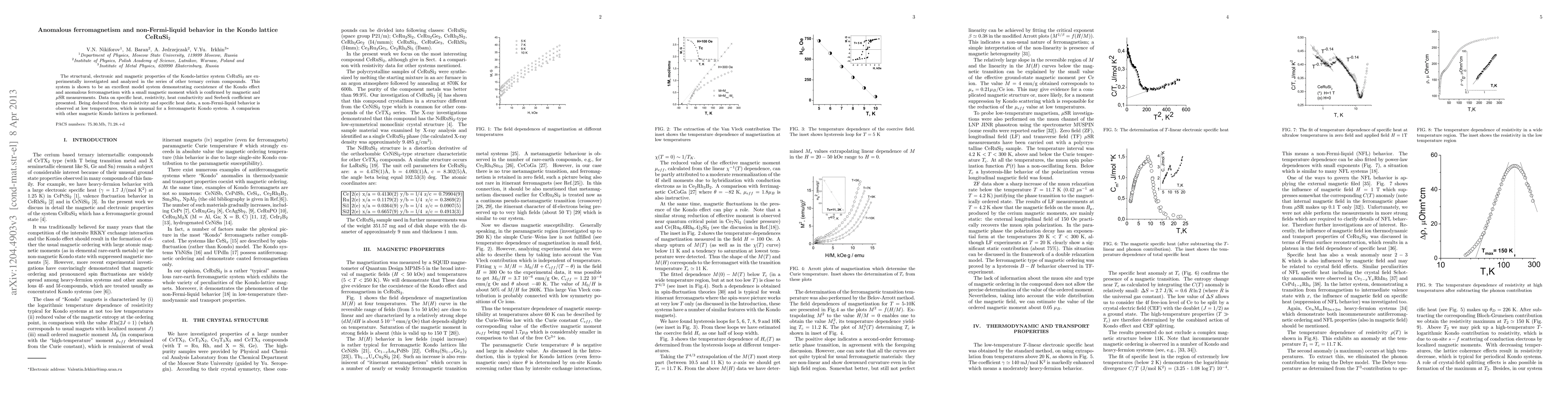 The structural, electronic and magnetic properties of the Kondo-lattice system CeRuSi2 are experimentally investigated and analyzed in the series of other ternary cerium compounds. This system is shown to be an excellent model system demonstrating coexistence of the Kondo effect and anomalous ferromagnetism with a small magnetic moment which is confirmed by magnetic and \mu SR measurements. Data on specific heat, resistivity and Seebeck coefficient are presented. Being deduced from the resistivity and specific heat data, the non-Fermi-liquid behavior is observed at low temperatures, which is unusual for a ferromagnetic Kondo system. A comparison with other magnetic Kondo lattices is performed.
