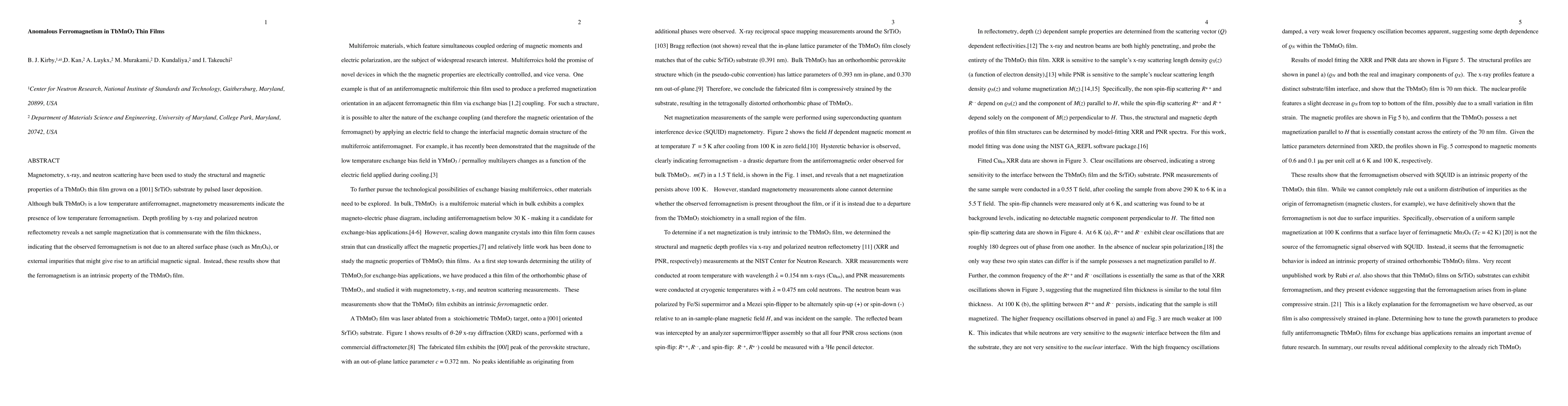Magnetometry, x-ray, and neutron scattering have been used to study the structural and magnetic properties of a TbMnO3 thin film grown on a [001] SrTiO3 substrate by pulsed laser deposition. Although bulk TbMnO3 is a low temperature antiferromagnet, magnetometry measurements indicate the presence of low temperature ferromagnetism. Depth profiling by x-ray and polarized neutron reflectometry reveals a net sample magnetization that is commensurate with the film thickness, indicating that the observed ferromagnetism is not due to an altered surface phase (such as Mn3O4), or external impurities that might give rise to an artificial magnetic signal. Instead, these results show that the ferromagnetism is an intrinsic property of the TbMnO3 film.