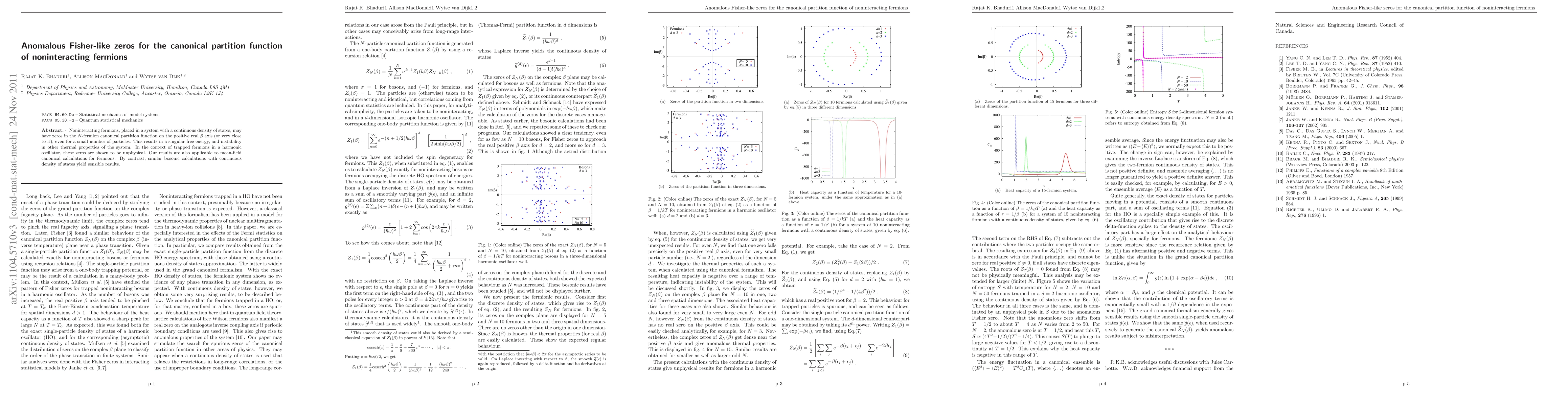 Noninteracting fermions, placed in a system with a continuous density of states, may have zeros in the $N$-fermion canonical partition function on the positive real $\beta$ axis (or very close to it), even for a small number of particles. This results in a singular free energy, and instability in other thermal properties of the system. In the context of trapped fermions in a harmonic oscillator, these zeros are shown to be unphysical. By contrast, similar bosonic calculations with continuous density of states yield sensible results.Noninteracting fermions, placed in a system with a continuous density of states yield sensible results.