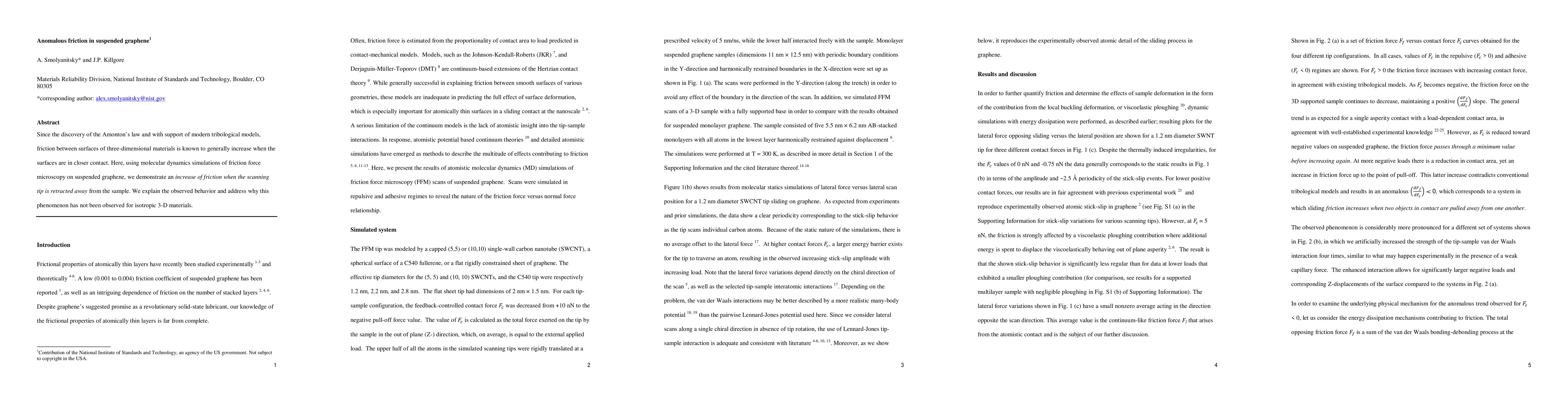 This research paper reveals anomalous friction behavior in suspended graphene, showing increased friction when the scanning tip moves away, contrary to Amonton's law, and explains this unique phenomenon using molecular dynamics simulations. The study highlights the distinctive friction dynamics of graphene compared to isotropic three-dimensional materials.
