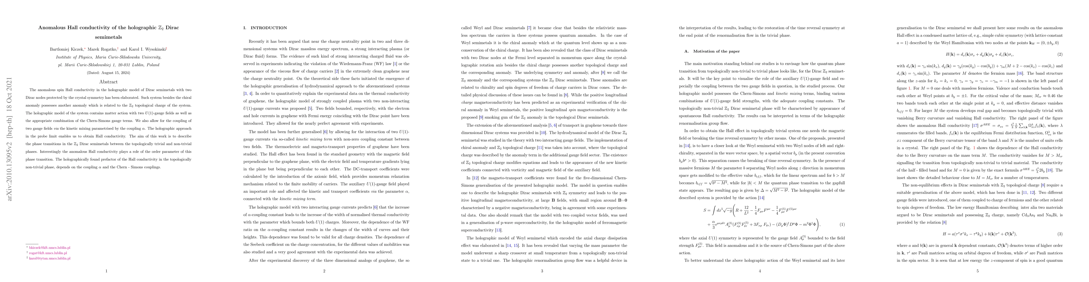 The anomalous spin Hall conductivity in the holographic model of Dirac semimetals with two Dirac nodes protected by the crystal symmetry has been elaborated. Such system besides the chiral anomaly possesses another anomaly which is related to the $\mathbb{Z}_2$ topological charge of the system. The holographic model of the system contains matter action with two $U(1)$-gauge fields as well as the appropriate combination of the Chern-Simons gauge terms. We also allow for the coupling of two gauge fields {\it via} the kinetic mixing parametrised by the coupling $\alpha$. The holographic approach in the probe limit enables us to obtain Hall conductivity. The aim of this work is to describe the phase transitions in the $\mathbb{Z}_2$ Dirac semimetals between the topologically trivial and non-trivial phases. Interestingly the anomalous Hall conductivity plays a role of the order parameter of this phase transition. The holographically found prefactor of the Hall conductivity in the topologically non-trivial phase, depends on the coupling $\alpha$ and the Chern - Simons couplings.