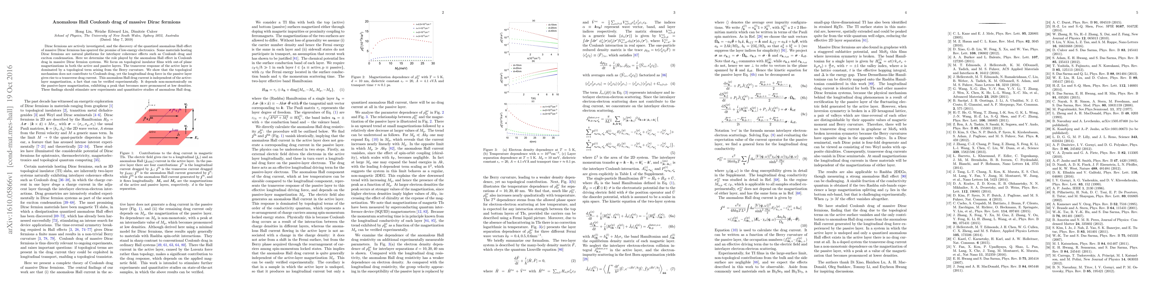 This study investigates the anomalous Hall effect's role in Coulomb drag within massive Dirac fermion systems, specifically in topological insulator films with out-of-plane magnetizations. It reveals that the topological mechanism does not contribute to Coulomb drag, but an anomalous Hall drag current arises from the passive layer's longitudinal drag force, which is experimentally verifiable and dependent on passive-layer magnetization.