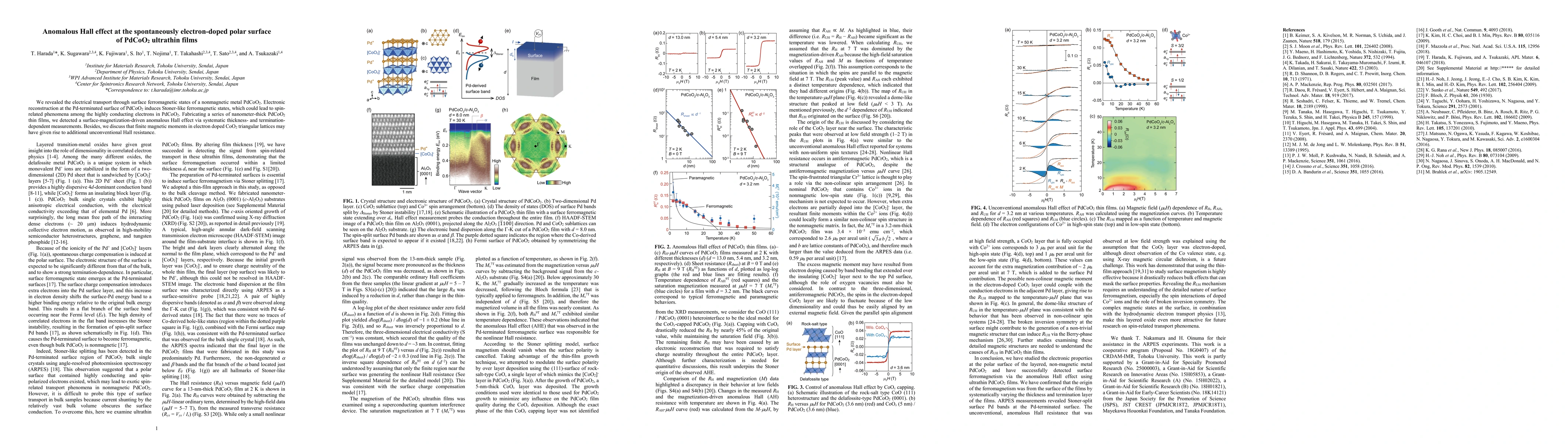 Summary: This study investigates the anomalous Hall effect in PdCoO2 ultrathin films, revealing the emergence of surface ferromagnetic states due to electronic reconstruction at the Pd-terminated surface. The research identifies a magnetization-driven anomalous Hall effect and suggests that finite magnetic moments in electron-doped CoO2 contribute to an unconventional Hall resistance.