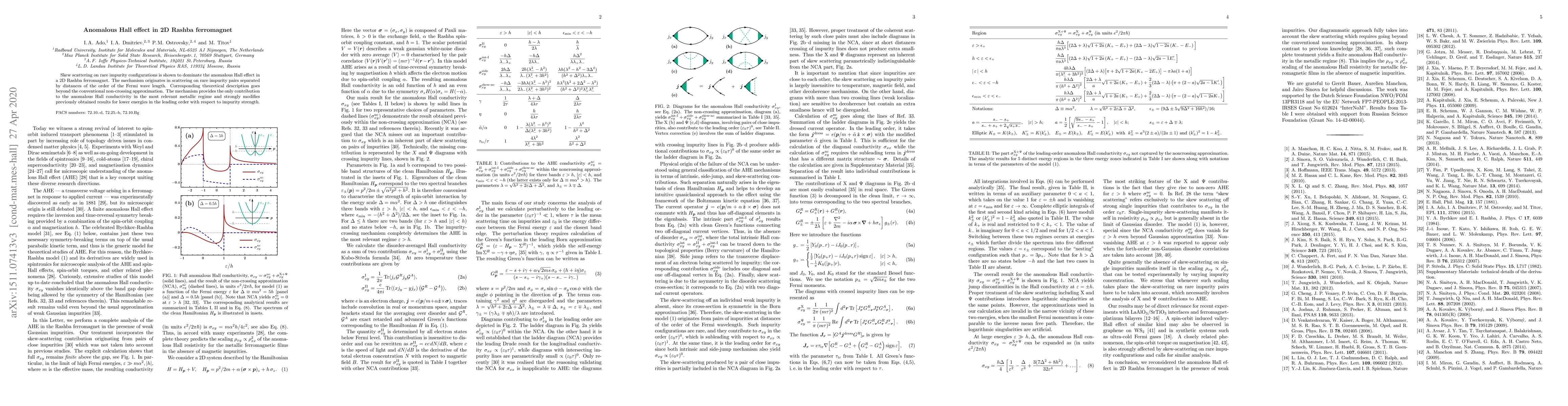 Summary: The anomalous Hall effect in a 2D Rashba ferromagnet is primarily driven by skew scattering from rare impurity pairs, challenging conventional non-crossing approximation and dominating at metallic regimes, which significantly alters lower energy predictions.