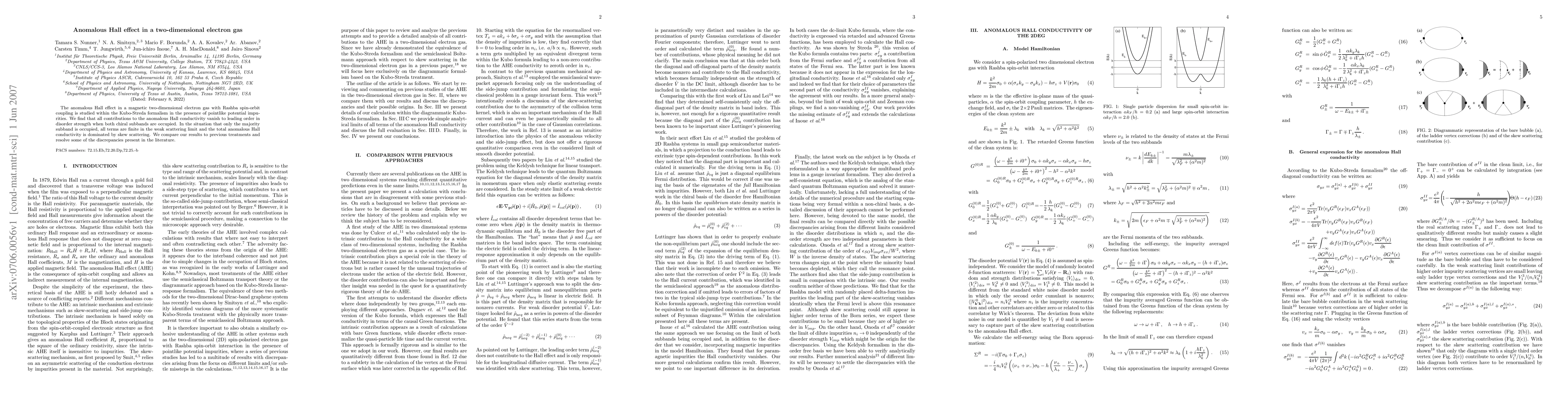 The research investigates the anomalous Hall effect in a two-dimensional electron gas with Rashba spin-orbit coupling, revealing that the effect vanishes when both chiral subbands are occupied, while skew scattering dominates when only the majority subband is filled. The findings reconcile some inconsistencies in prior studies.