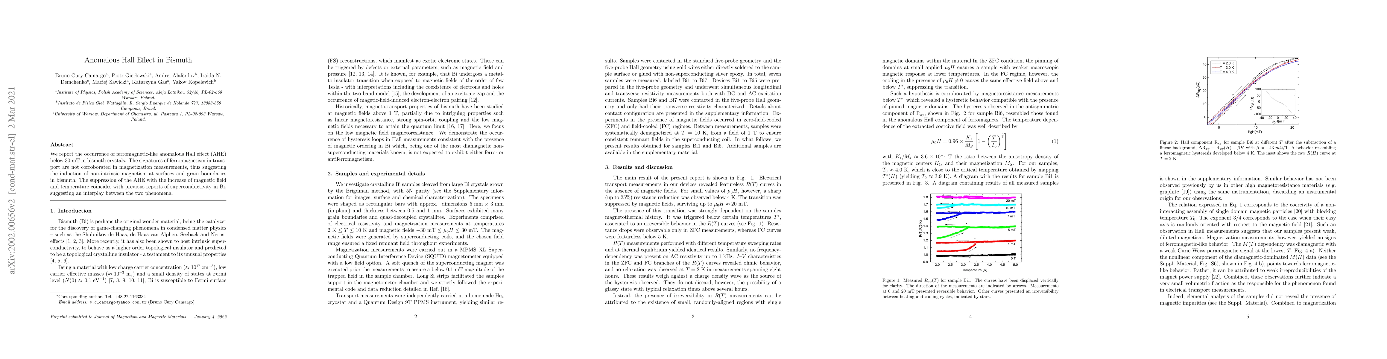This study reveals a ferromagnetic-like anomalous Hall effect in bismuth below 30 mT, despite no corresponding ferromagnetism in magnetization measurements, indicating induced non-intrinsic magnetism at surfaces and grain boundaries. The effect diminishes with higher magnetic fields and temperatures, hinting at an interaction between the AHE and superconductivity in bismuth.