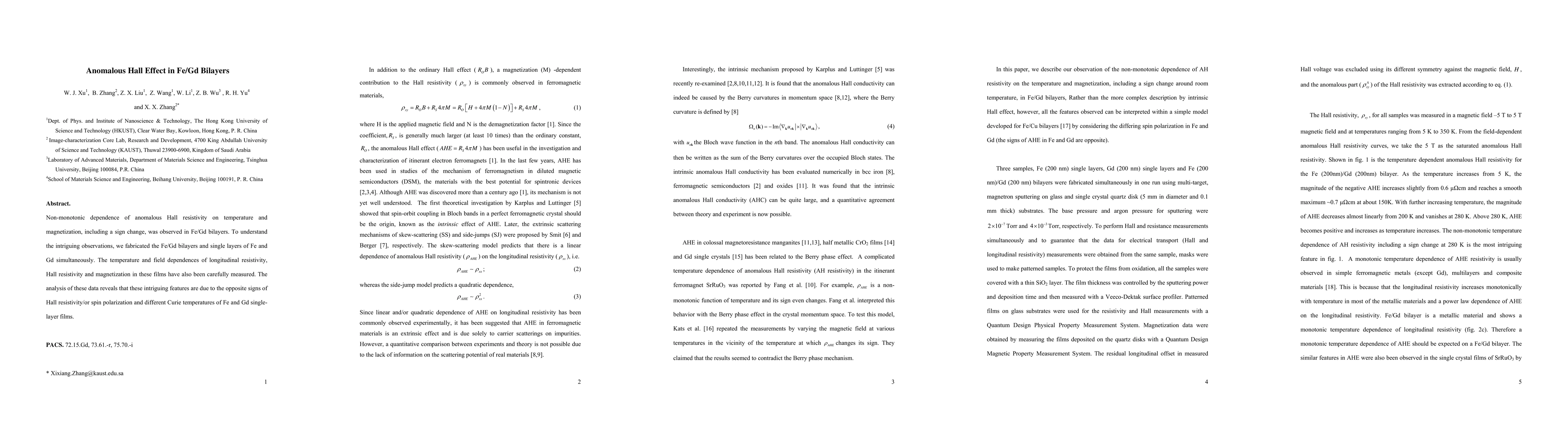 Summary: Researchers observed a non-monotonic temperature and magnetization dependence of the anomalous Hall effect in Fe/Gd bilayers, including a sign change, attributed to the differing Curie temperatures and spin polarizations of Fe and Gd single layers. This study elucidates the interplay between these materials in bilayer form.