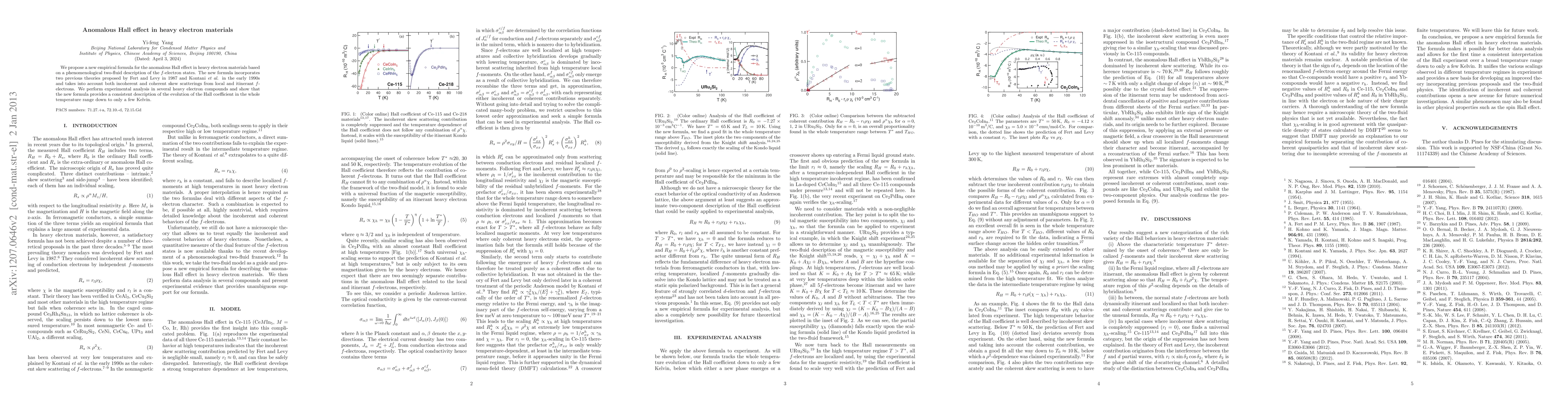 The paper proposes a new empirical formula for the anomalous Hall effect in heavy electron materials, integrating previous theories and considering both incoherent and coherent scatterings. Experimental validation across several compounds confirms the formula's consistency in describing the Hall coefficient evolution from room temperature to low Kelvin.