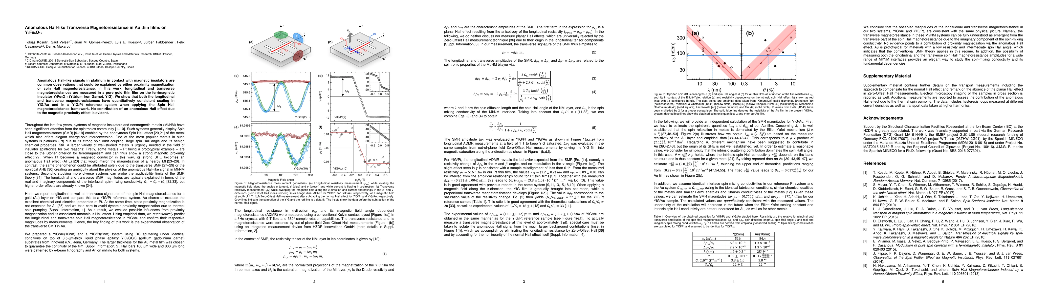 Anomalous Hall-like signals in platinum in contact with magnetic insulators are common observations that could be explained by either proximity magnetization or spin Hall magnetoresistance. In this work, longitudinal and transverse magnetoresistances are measured in a pure gold thin film on the ferrimagnetic insulator Y$_3$Fe$_5$O$_{12}$ (Yttrium Iron Garnet, YIG). We show that both the longitudinal and transverse magnetoresistances have quantitatively consistent scaling in YIG/Au and in a YIG/Pt reference system when applying the Spin Hall magnetoresistance framework. No contribution of an anomalous Hall effect due to the magnetic proximity effect is evident.