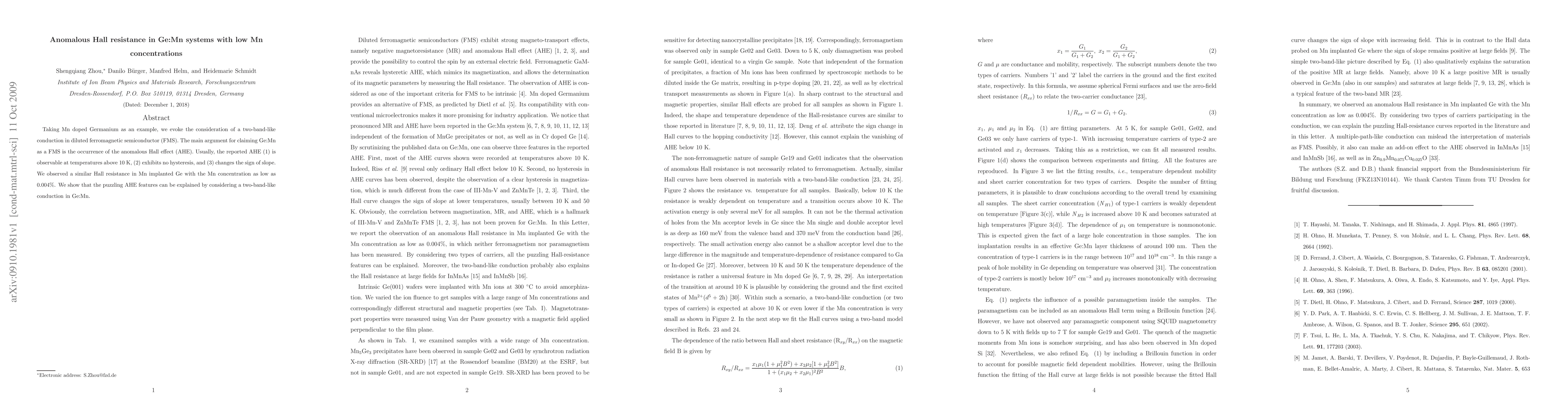 Taking Mn doped Germanium as an example, we evoke the consideration of a two-band-like conduction in diluted ferromagnetic semiconductor (FMS). The main argument for claiming Ge:Mn as a FMS is the occurrence of the anomalous Hall effect (AHE). Usually, the reported AHE (1) is observable at temperatures above 10 K, (2) exhibits no hysteresis, and (3) changes the sign of slope. We observed a similar Hall resistance in Mn implanted Ge with the Mn concentration as low as 0.004%. We show that the puzzling AHE features can be explained by considering a two-band-like conduction in Ge:Mn.