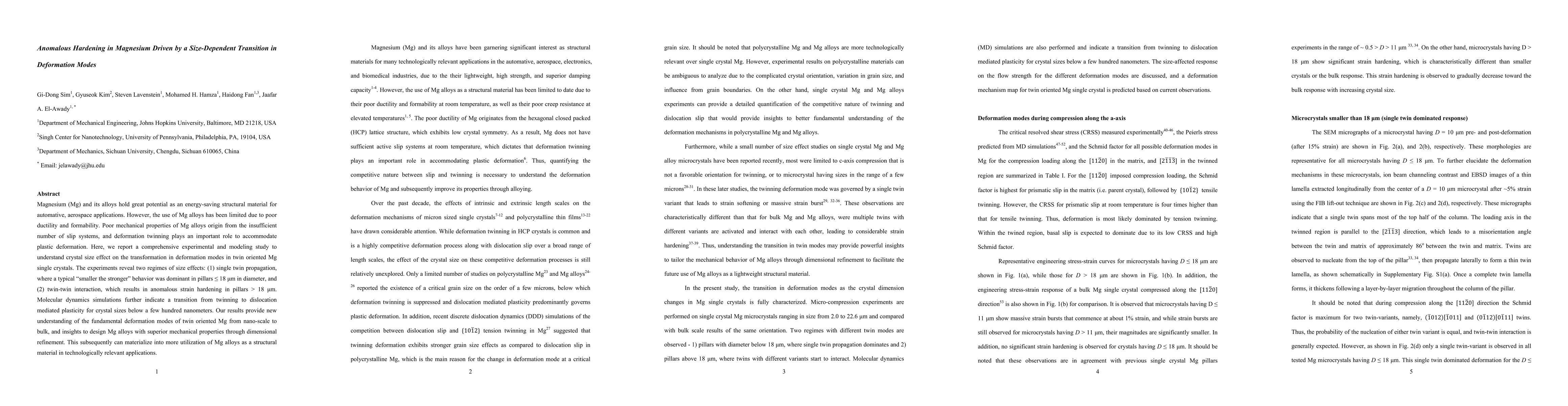 This study investigates the size-dependent deformation modes in twin-oriented magnesium single crystals, revealing two regimes: smaller pillars exhibit "smaller the stronger" behavior, while larger pillars show anomalous strain hardening due to twin-twin interactions. Molecular dynamics simulations suggest a transition from twinning to dislocation-mediated plasticity in nano-sized crystals, offering insights for designing Mg alloys with enhanced mechanical properties.