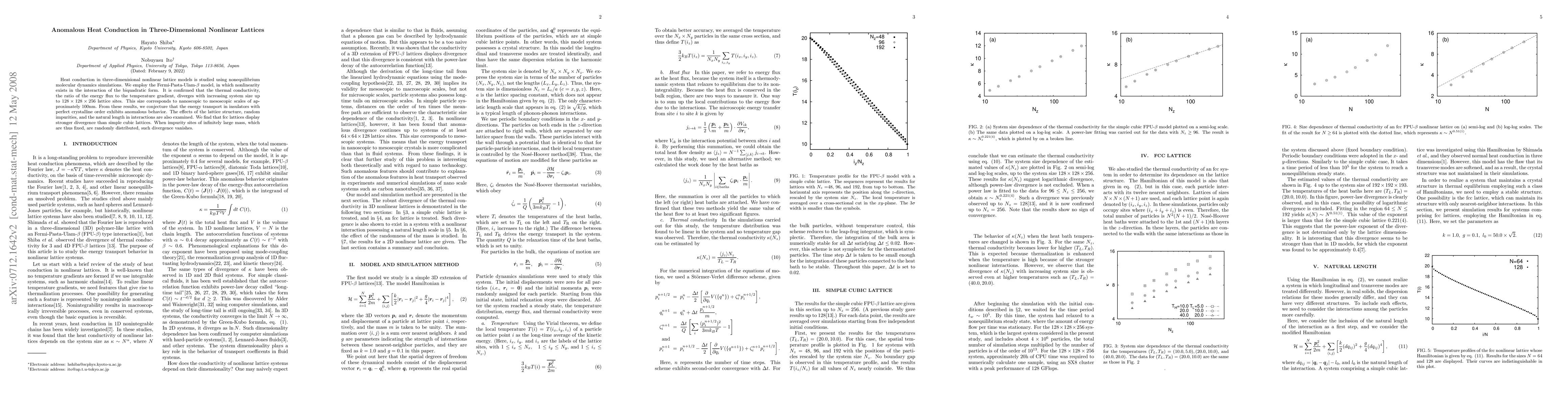 This study investigates anomalous heat conduction in three-dimensional nonlinear lattices using nonequilibrium molecular dynamics simulations. The results show that thermal conductivity diverges in lattices up to 128x128x256 sites, suggesting anomalous energy transport in insulators with perfect order, with fcc lattices exhibiting stronger divergence than simple cubic ones.