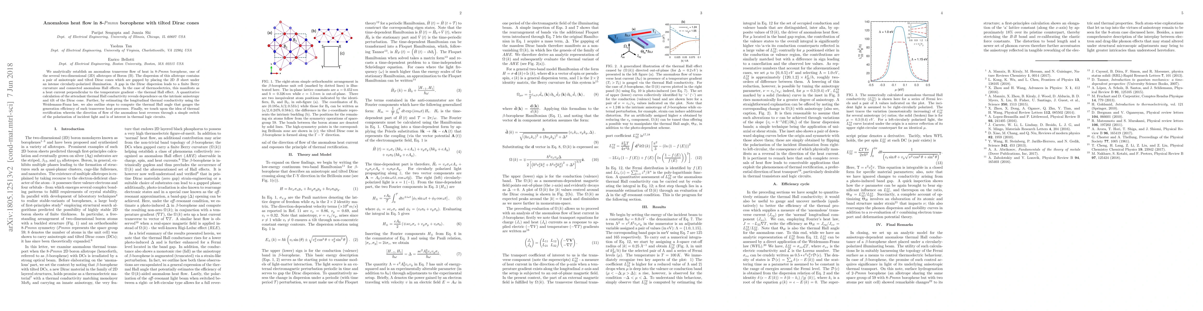 We analytically establish an anomalous transverse flow of heat in 8-\textit{Pmmn} borophene, one of the several two-dimensional (2D) allotropes of Boron (B). The dispersion of this allotrope contains a pair of anisotropic and tilted Dirac cones which are gapped by placing the 2D \textit{B} sheet under an intense circularly-polarized illumination. A gap in the Dirac dispersion leads to a finite Berry curvature and connected anomalous Hall effects. In the case of thermoelectrics, this manifests as a heat current perpendicular to the temperature gradient - the thermal Hall effect. A quantitative calculation of the attendant thermal Hall conductivity reveals dependence on the intrinsic anisotropy and tilt of the Dirac cone. Further, by estimating the longitudinal thermal conductivity using the Weidemann-Franz law, we also outline steps to compute the thermal Hall angle that gauges the generation efficiency of such transverse heat processes. Finally, we touch upon the idea of thermal rectification wherein the direction of flow of the anomalous heat reverses through a simple switch of the polarization of incident light and is of interest in thermal logic circuits.