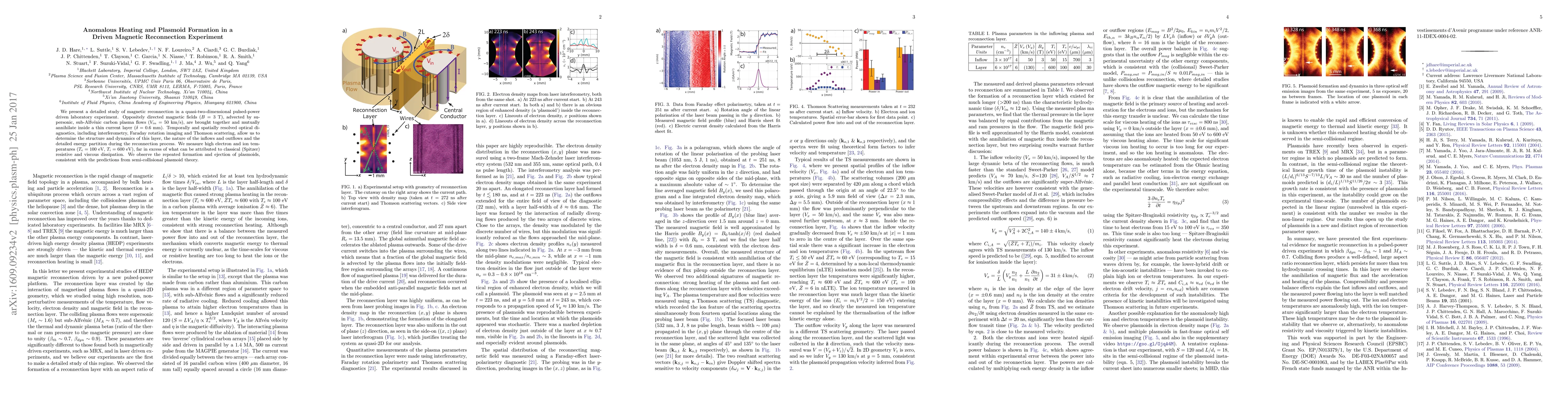 This study investigates magnetic reconnection in a laboratory experiment using pulsed-power, revealing anomalous heating and plasmoid formation. High electron and ion temperatures, exceeding classical dissipation, suggest two-fluid effects and complex energy partitioning during reconnection.