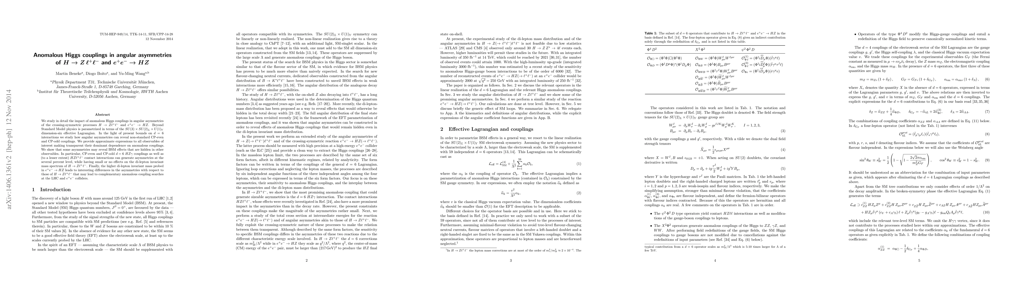 We study in detail the impact of anomalous Higgs couplings in angular asymmetries of the crossing-symmetric processes H --> Zl+l- and e+e- --> HZ. Beyond Standard Model physics is parametrized in terms of the SU(3)xSU(2)_LxU(1)_Y dimension-six effective Lagrangian. In the light of present bounds on d = 6 interactions we study how angular asymmetries can reveal non-standard CP-even and CP-odd couplings. We provide approximate expressions to all observables of interest making transparent their dominant dependence on anomalous couplings. We show that some asymmetries may reveal BSM effects that are hidden in other observables. In particular, CP-even and CP-odd d = 6 HZgamma couplings as well as (to a lesser extent) HZll contact interactions can generate asymmetries at the several percent level, while having small or no effects on the di-lepton invariant mass spectrum of H --> Zl+l-. Finally, the higher di-lepton invariant mass probed in e+e- --> HZ leads to interesting differences in the asymmetries with respect to those of H --> Zl+l- that may lead to complementary anomalous coupling searches at the LHC and e+e- colliders.