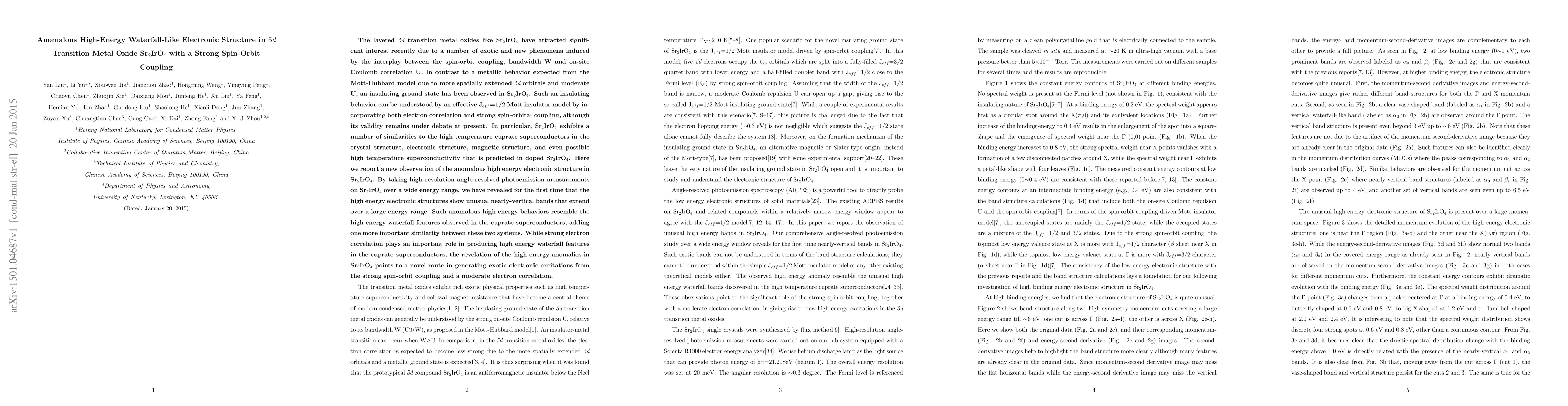 This paper reports on the discovery of an anomalous high-energy "waterfall-like" electronic structure in Sr2IrO4, a 5d transition metal oxide, observed through high-resolution angle-resolved photoemission spectroscopy. The study highlights similarities between Sr2IrO4 and high-temperature cuprate superconductors, suggesting a novel mechanism for generating exotic electronic excitations via strong spin-orbit coupling and moderate electron correlation.