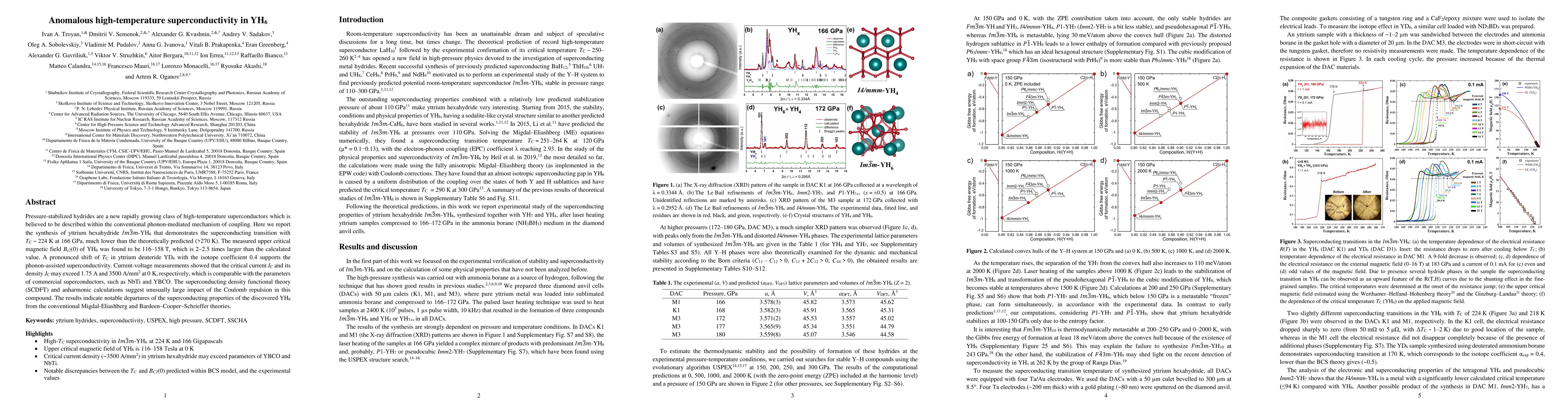This paper reports the synthesis of yttrium hexahydride (YH$_6$), which exhibits high-temperature superconductivity with T$_c$ = 224 K under high pressure, challenging conventional phonon-mediated superconductivity theories. The compound shows a large upper critical magnetic field and critical current density, comparable to commercial superconductors, suggesting significant deviations from standard superconductivity models.