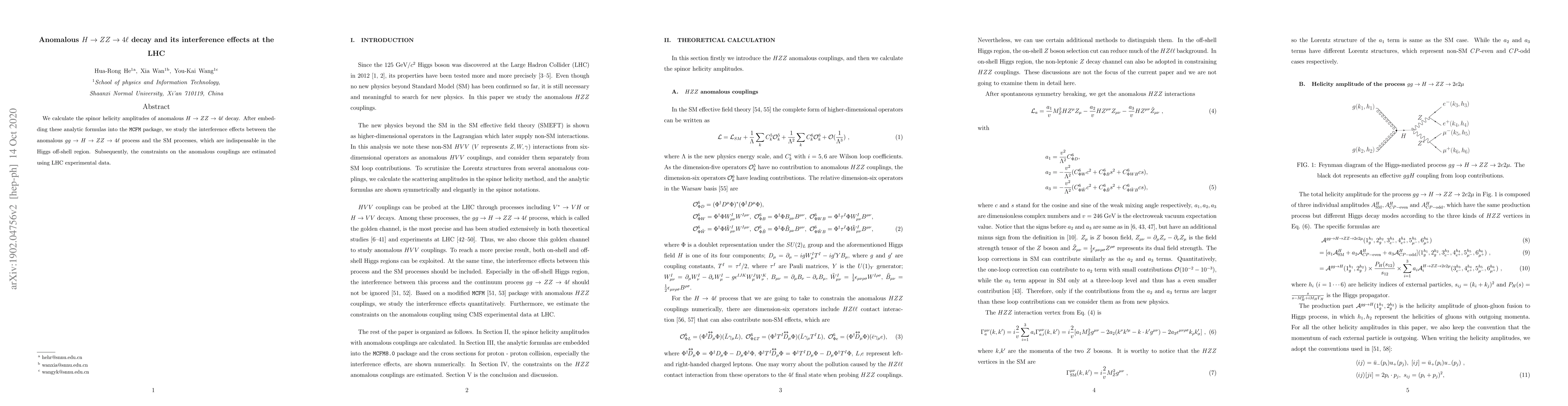 This paper calculates the spinor helicity amplitudes for the anomalous decay $H\to ZZ \to 4\ell$ and studies the interference effects between this process and Standard Model processes at the LHC. It estimates constraints on anomalous couplings using LHC experimental data.