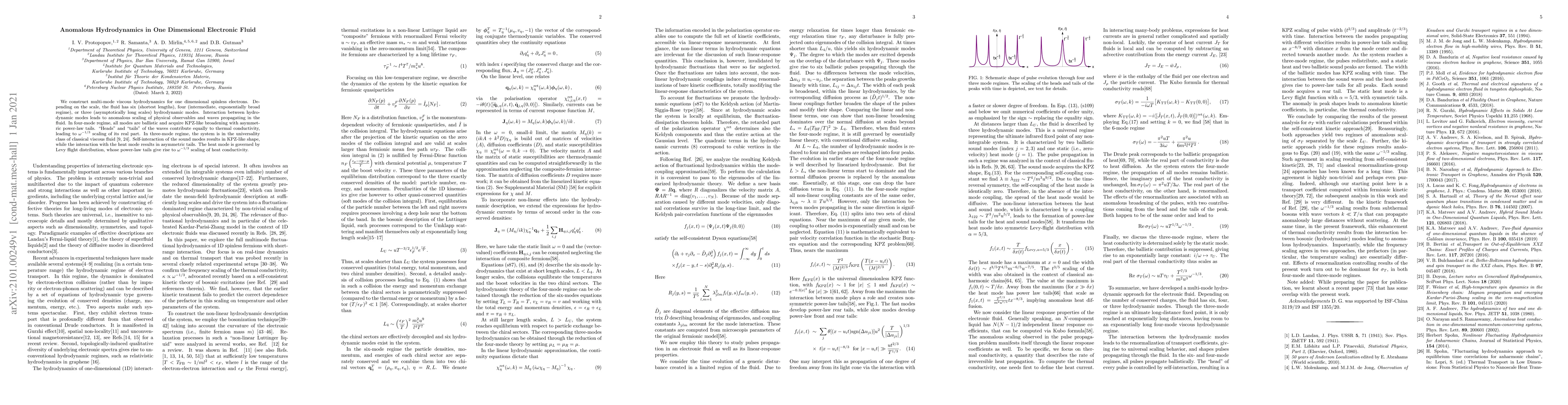 We construct multi-mode viscous hydrodynamics for one dimensional spinless electrons. Depending on the scale, the fluid has six (shortest lengths), four (intermediate, exponentially broad regime), or three (asymptotically long scales) hydrodynamic modes. Interaction between hydrodynamic modes leads to anomalous scaling of physical observables and waves propagating in the fluid. In a four-mode regime, all modes are ballistic and acquire KPZ-like broadening with asymmetric power-law tails. "Heads" and "tails" of the waves contribute equally to thermal conductivity, leading to $\omega^{-1/3}$ scaling of its real part. In a three-mode regime, the system is in the universality class of classical viscous fluid[9,24]. Self-interaction of the sound modes results in KPZ-like shape, while the interaction with the heat mode results in asymmetric tails. The heat mode is governed by Levy flight distribution, whose power-law tails give rise to $\omega^{-1/3}$ scaling of heat conductivity.