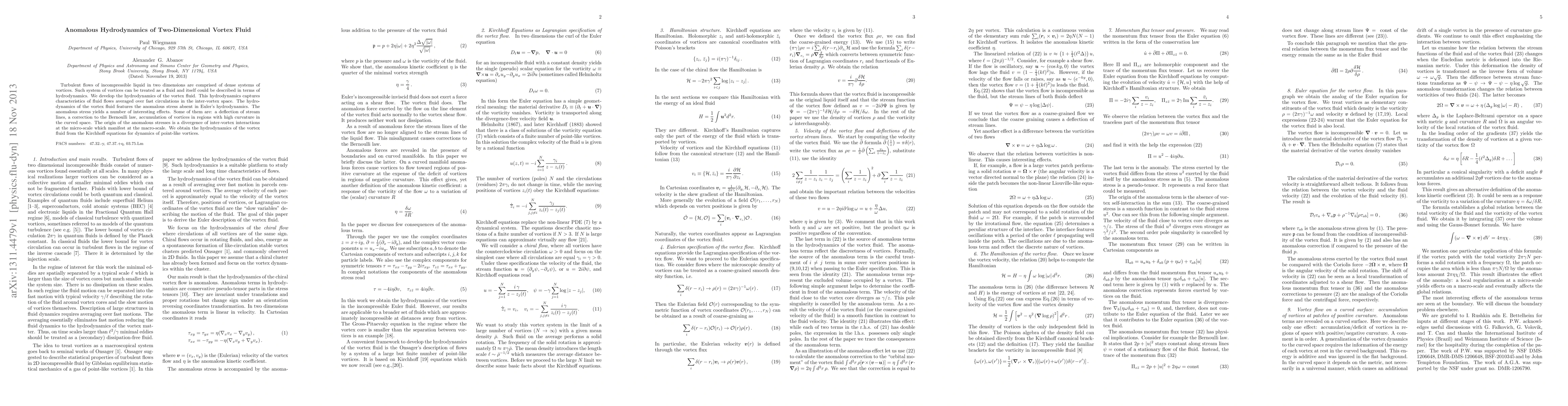 Turbulent flows of incompressible liquid in two dimensions are comprised of dense systems of vortices. Such system of vortices can be treated as a fluid and itself could be described in terms of hydrodynamics. We develop the hydrodynamics of the vortex fluid. This hydrodynamics captures characteristics of fluid flows averaged over fast circulations in the inter-vortex space. The hydrodynamics of the vortex fluid features the anomalous stress absent in Euler's hydrodynamics. The anomalous stress yields a number of interesting effects. Some of them are: a deflection of stream lines, a correction to the Bernoulli law, accumulation of vortices in regions with high curvature in the curved space. The origin of the anomalous stresses is a divergence of inter-vortex interactions at the micro-scale which manifest at the macro-scale. We obtain the hydrodynamics of the vortex fluid from the Kirchhoff equations for dynamics of point-like vortices