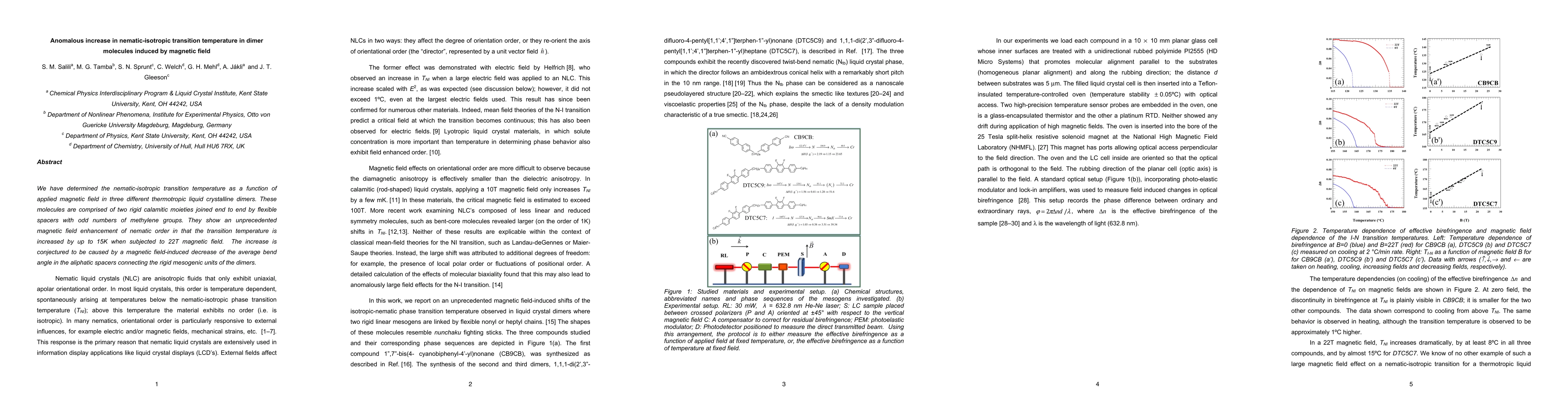 This study investigates the effect of magnetic fields on the nematic-isotropic transition temperature in thermotropic liquid crystalline dimer molecules, revealing a significant increase of up to 15K under 22T magnetic fields, likely due to a magnetic field-induced reduction in the average bend angle of the aliphatic spacers.